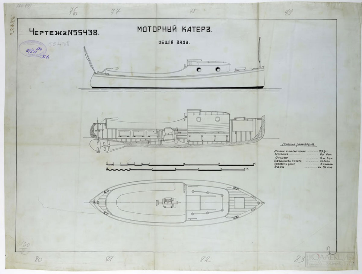[13] ЦГИА СПб. Фонд 2005. Опись 1. Дело 74. Чертежи разведочных катеров, моторных катеров №№ 1 и 2 и моторного катера миноносца типа «Орфей».