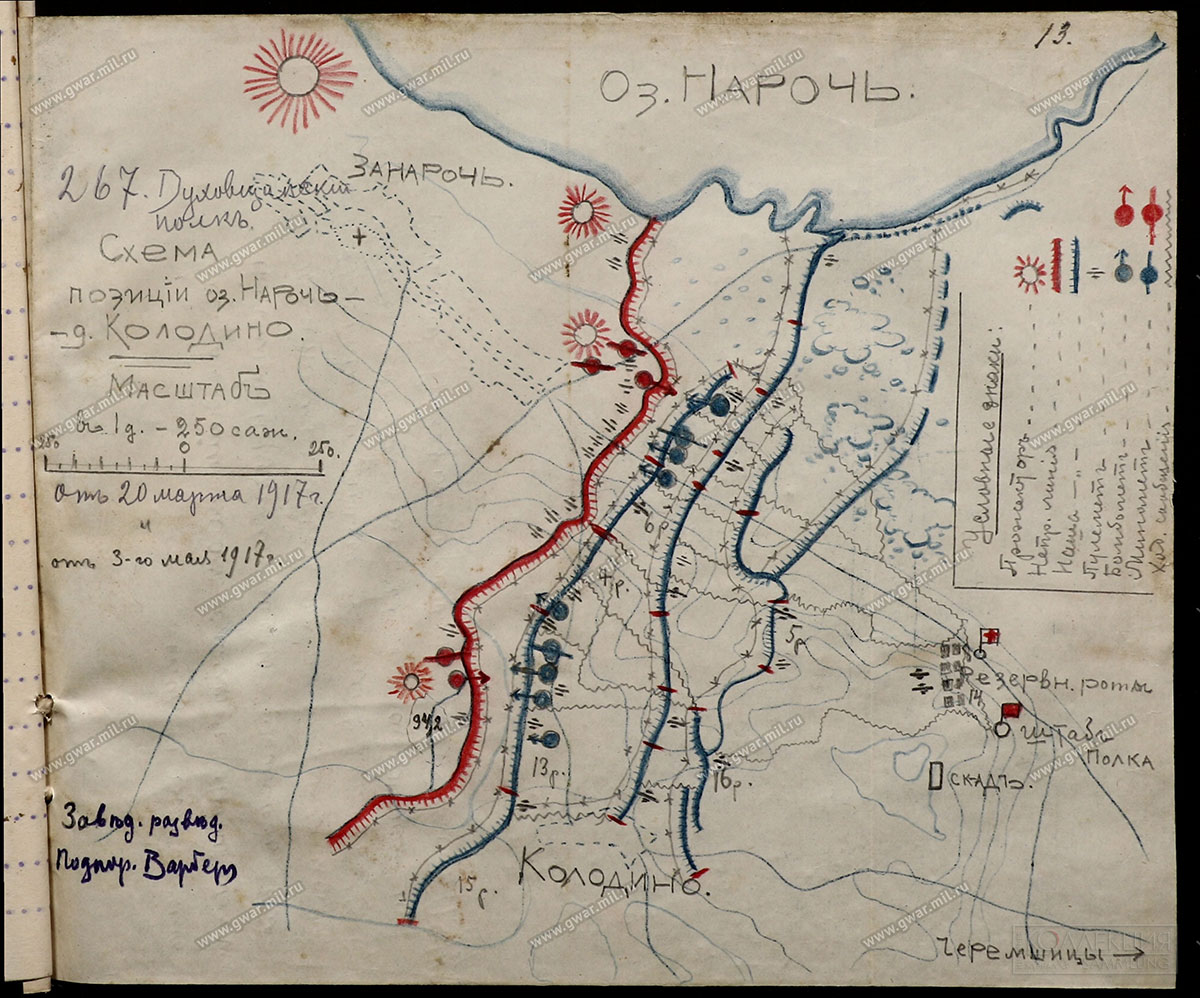 Позиции 267-го пехотного Духовщинского полка южнее озера Нарочь. На карте показаны позиции противника и места расположения его прожекторов