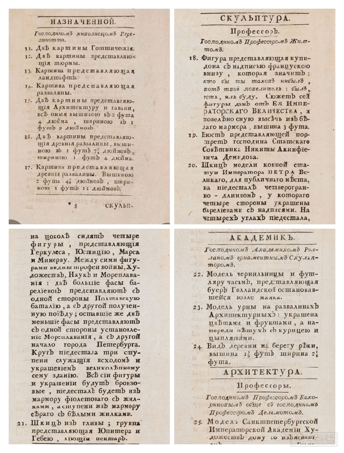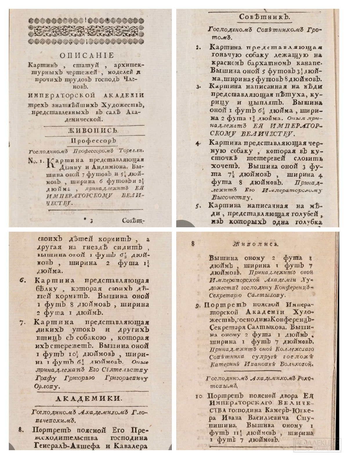 «Здесь найдёте описание представленных трудов императорской Академии трёх знатнейших художеств господ членов, которые означены номерами соответствующими здесь вписанными, дабы удобнее можно узнать, чей труд и что оный значит».