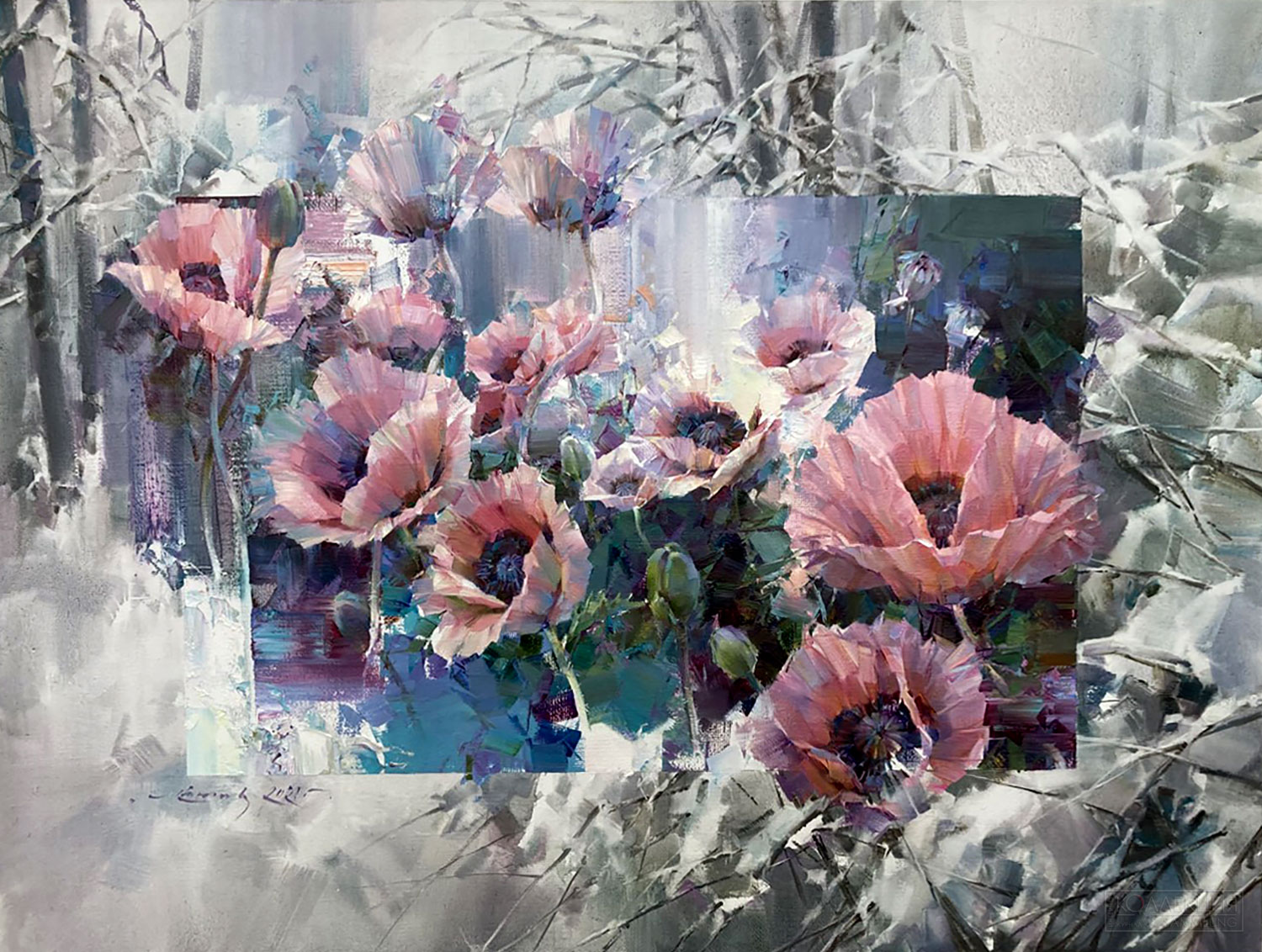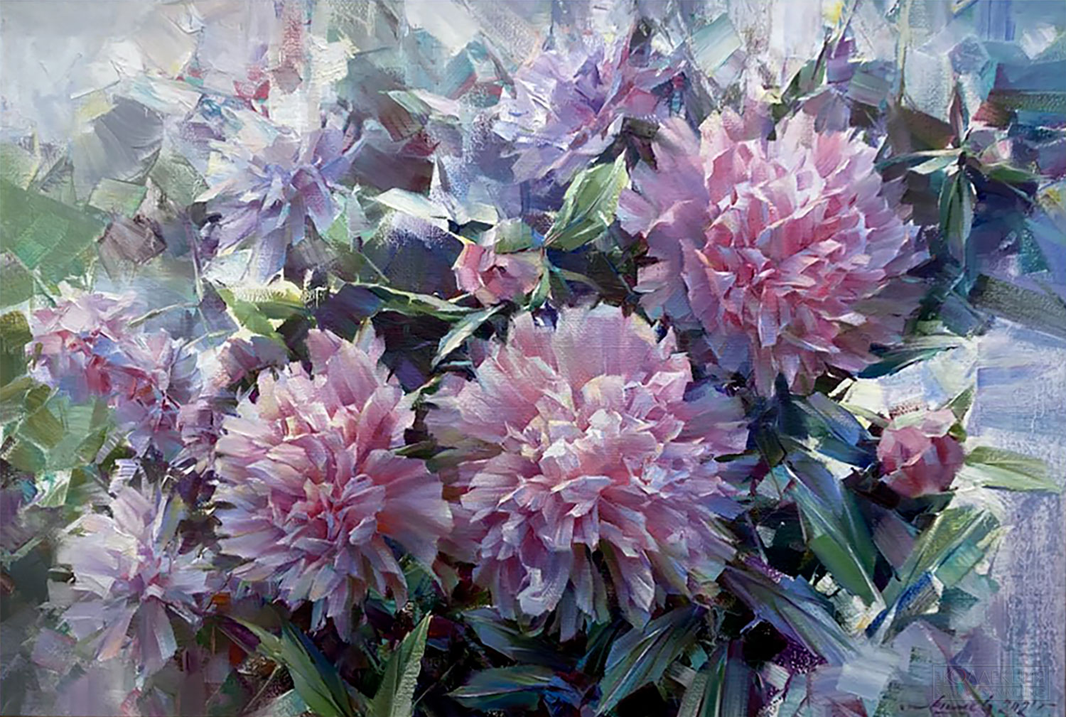 Его работы и впрямь воспринимаешь всеми органами чувств, и, несмотря на их сюжетную простоту, они оказывают завораживающее, почти мистическое воздействие. Этому способствуют даже названия картин: «Мания», «Очарованный берег», «Магия», «Путешествие», «Абсолют». Пейзажи и цветы становятся проводниками в сказочный мир, который на удивление реален, но существует глубоко внутри нас. По-особенному исполнена чарующая венецианская серия. Словно проводишь рукою по влажному стеклу, и вдруг как по волшебству на его поверхности проступают образы, нежные и неуловимые, готовые через секунду вновь исчезнуть, оставив послевкусие чудесного видения.