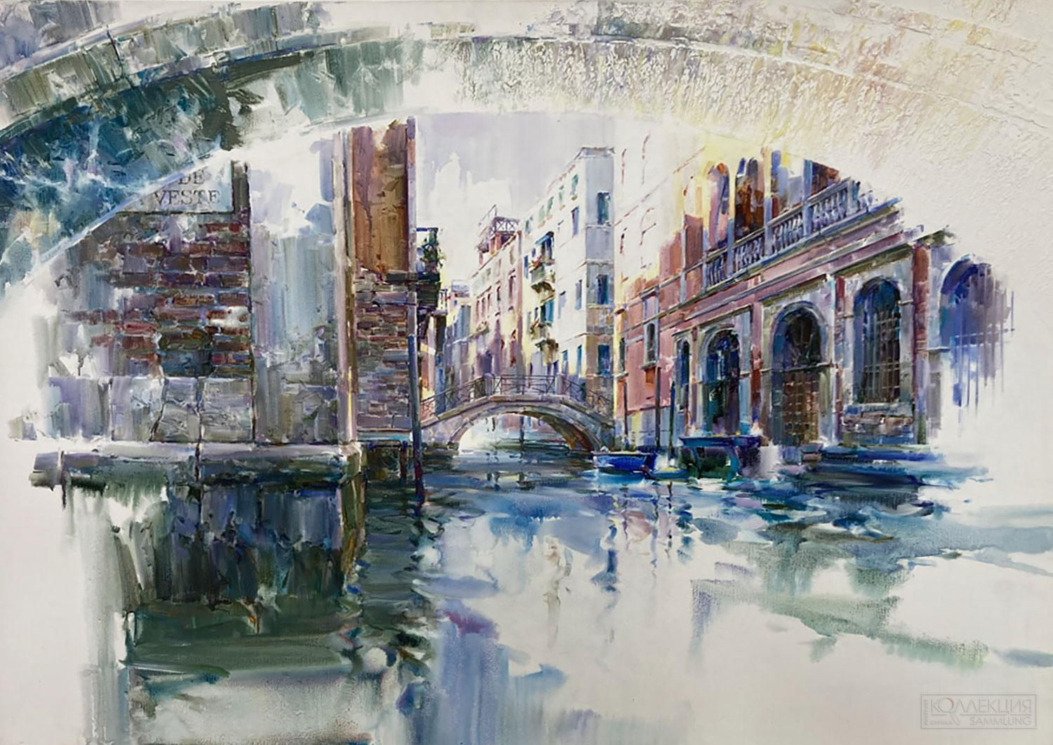И ещё одно важное наблюдение. Несмотря на довольно насыщенную цветовую палитру, картины не вызывают нервозности и возбуждения, но наоборот при взгляде на них будто бы всё стихает внутри. И вот уже нет заполненного людьми зала, только ты, плывущий на зыбкой гондоле по темной воде канала, или ставший бутоном весеннего цветка, что колышется на ветру. Стоит только захотеть и за долю секунды можно совершить настоящее путешествие в волшебный мир образов и самых невероятных фантазий. Вот такие вот чудеса.