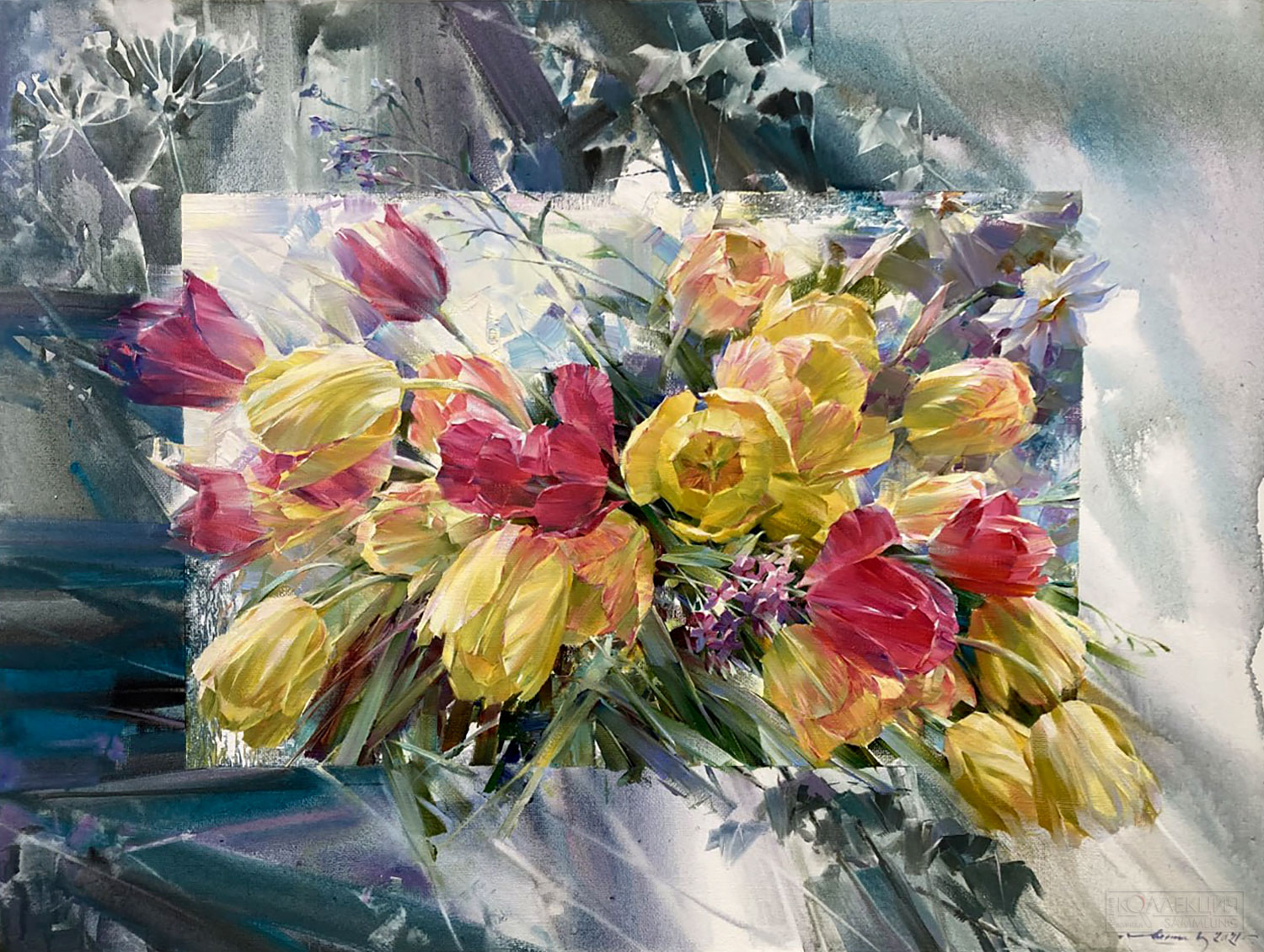Акварельная весна — так называется выставка художника Олега Тимошина, которая заканчивается в Выставочном зале Московского Союза Художников на Рождественке. Амплуа художника – лирические пейзажи, живописные цветочные композиции, изящные городские виды. Большинство работ выполнено в сложной технике акварели на холсте, что само по себе является необычным сочетанием. Но самое главное, картины художника живые и жизнеутверждающие.