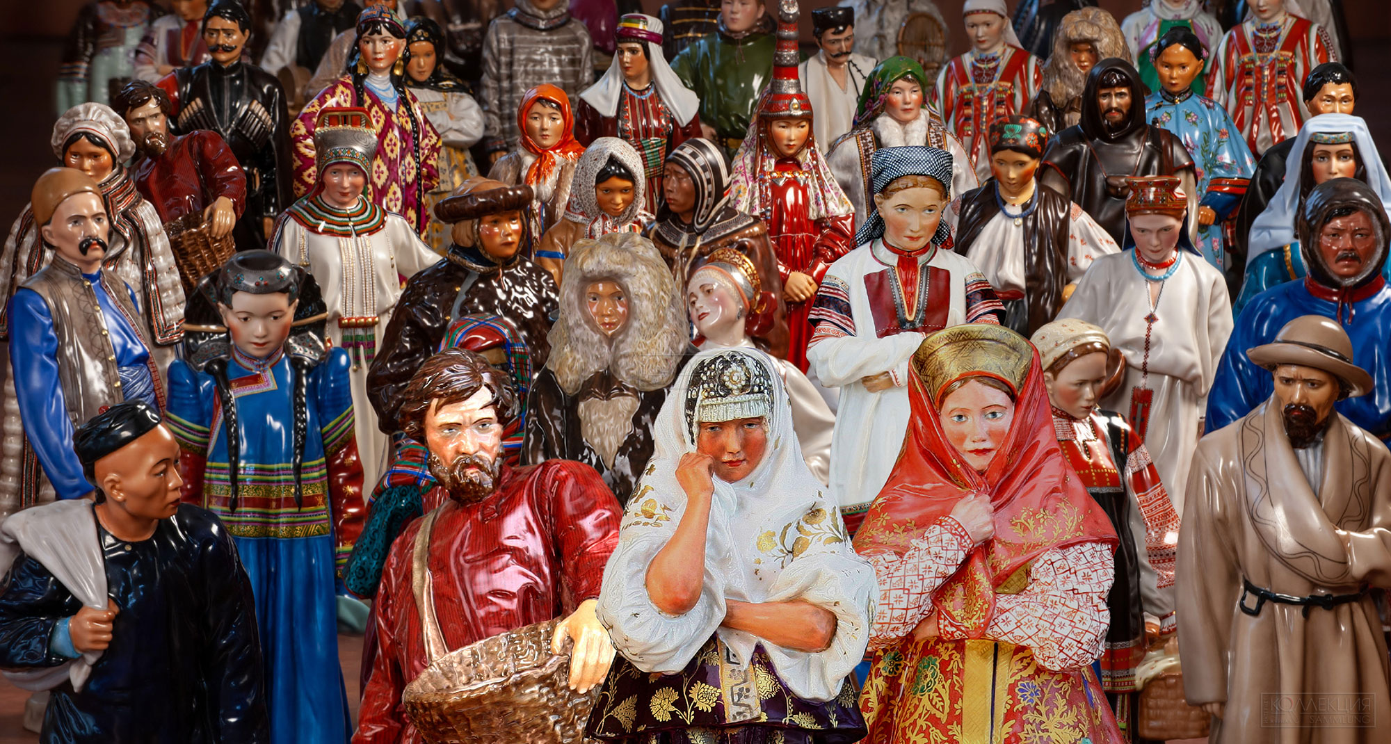 Посетители выставки отправятся в путешествие по стране — Русскому Северу, Кавказу, Уралу, Сибири и Дальнему Востоку. В центре внимания — легендарная коллекция фарфоровых скульптур «Народности России». Масштабная серия из 74 фигур, изображающих народы Российской империи, была создана в честь празднования 300-летия дома Романовых по личному распоряжению императора Николая II. Фарфоровая коллекция отражала культурное и этническое разнообразие великой страны.
