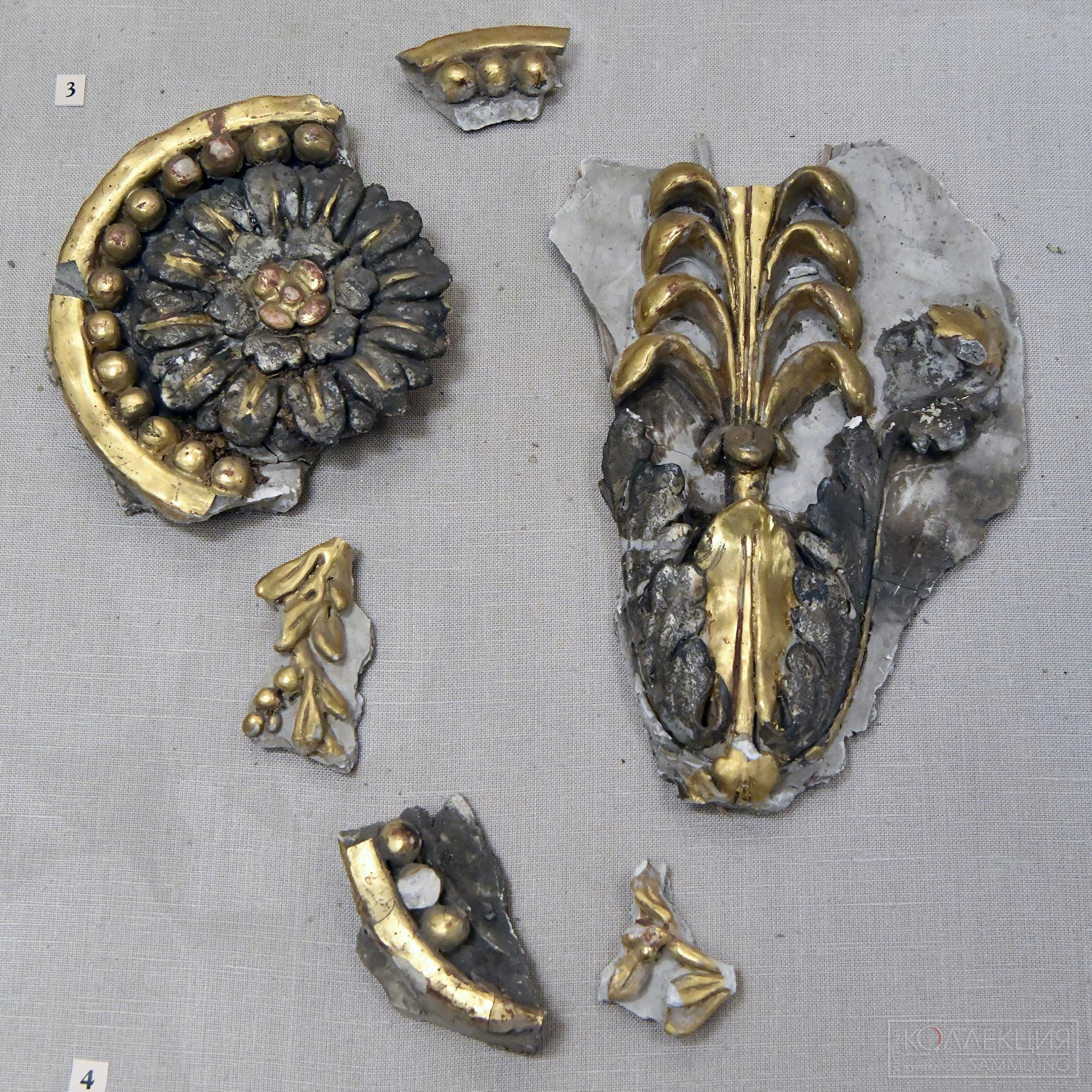 - Позолоченные и посеребрённые элементы лепки залов парадного этажа Строгановского дворца, отделанных для княгини А. П. Голицыной