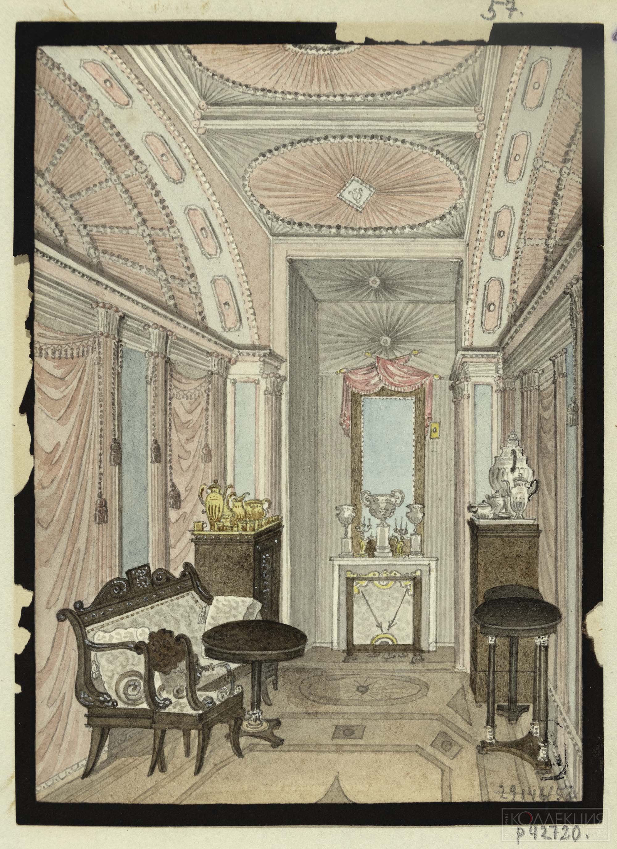 Одновременно с выставкой в Академии подходил к апогею роман Аделаиды Строгановой и князя Василия Голицына. Точная дата и даже время соединения двух славных родов известно: в семье хранилась икона, которой мать, «… графиня С. В. Строганова, благословила дочь свою Аглаиду Павловну, в день помолвки её за князя Василия Сергеевича Голицына, октября 14-го числа пополудни в 12-ть часов 1820 года». [35] То есть, церемония произошла немедленно после закрытия экспозиции: очевидно, что роман развивался параллельно с работой Демута (и Росси), а апофеоз любовной истории совпал с триумфом скульптора, архитектора и двух графинь — Софьи и Аделаиды — стремившихся обыграть в «гонке интерьеров» графа Сергея, некоторые факты биографии которого, вероятно, следует привести здесь. В 1810 году он поступил в созданный Бетанкуром Институт корпуса инженеров путей сообщения. С началом Отечественной войны тогда ещё барон вступил в действующую армию, где отличился в ряде сражений и сделал блестящую карьеру. 29 октября 1812 года он был произведён в подпоручики; получил орден Святого Владимира 4-й степени с бантом. За отличие в сражении при Лейпциге в 1813 году стал капитаном. Спустя два оказался уже поручиком гвардии с назначением адъютантом к генералу от кавалерии барону Фердинанду Винцингероде и переводом в лейб-гвардии Литовский полк. В 1816 году был произведён в штабс-ротмистры с переводом в лейб-гвардии Гусарский полк. В трагический для дяди П. А. Строганова 1817 году получил назначение адъютантом к начальнику Главного штаба генерал-лейтенанту, а чуть позже, уже в чине ротмистра, флигель-адъютантом императора Александра I. Это восхождение увенчалось женитьбой в 1818 году в Москве на графине Наталье Строгановой по решению её матери, которая приходилась родственницей и Сергею. Перед ним стояла аналогичная задача создания залов, отзывающихся к виктории российского общества. В собрании ГМИИ хранится опубликованный единственный раз более двадцати лет назад, но не прокомментированный должным образом лист О. Монферрана, который в 1819-1820 годах, то есть, одновременно с Росси, проектировал неизвестные до настоящего времени столичный дом, или только апартаменты. В 1825 году Сергей, ставший в результате брака графом, открыл в Москве «Школу рисования в отношении к искусствам и ремеслам» и считалось, что он после женитьбы, или даже до нее, проживал в древней столице. Факт рождения, по крайней мере, двух старших сыновей – Александра (1818-1864) и Павла (1823-1910) – в Санкт-Петербурге, а также рассматриваемый графический раритет позволяют в этом усомниться.
