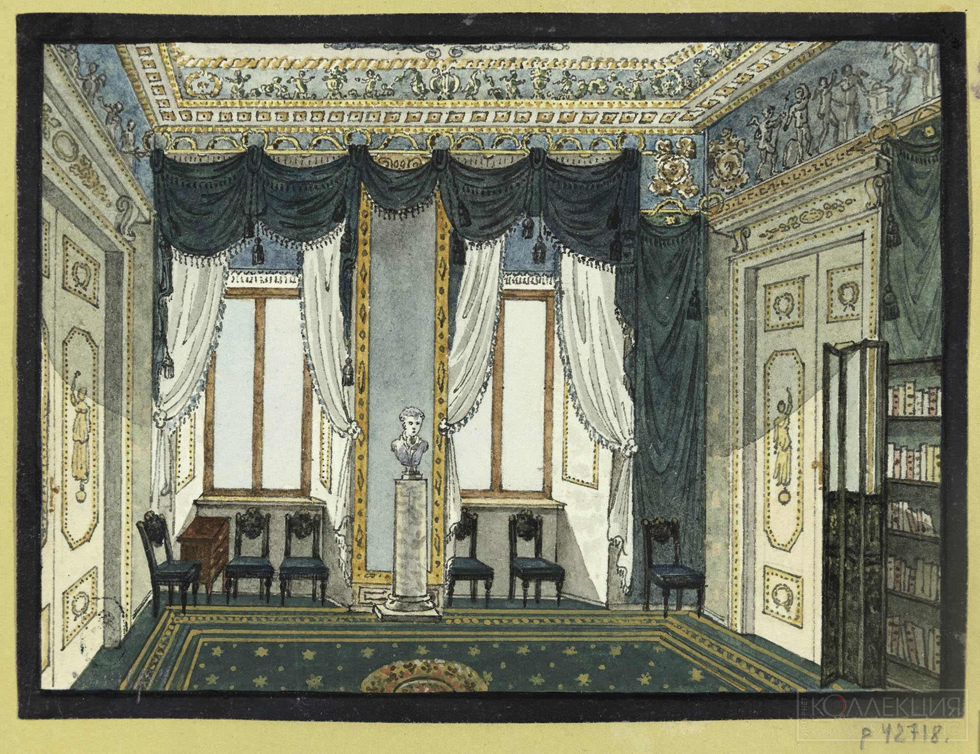 Карл Росси не подписал и не датировал свой проект, представив его заказчице необычным образом: как перспективные виды каждого из девяти покоев зала с двух противоположных точек вкупе с планом – по три миниатюрные картинки размером 8х11 cм на отдельном листе. Ими, предположительно в 1819-1820-х годах было занято девять листов её личного альбома (проекту посвящена статья «Исчезнувшие интерьеры Строгановского дворца», написанная нами в сотрудничестве с Е. В. Карповой четверть века назад и потому нуждающаяся в развитии в том числе в связи с новыми данными).[23] Среди залов парадного этажа главное место было уделено «Salon d’Аdel» — первому интерьеру при входе из Большого зала, а также её Большому кабинету. В обоих помещениях предполагалось не только расписать плафон, но и поместить несколько барельефов, заказ на которые вполне мог быть отдан В. Демут-Малиновскому, постоянному сотруднику Росси в его других проектах. В кабинете находим искомый бюст, поставленным у зеркала между окон как некий комнатный монумент погибшего брата, предположительно оказавшийся впоследствии в Касимове.
