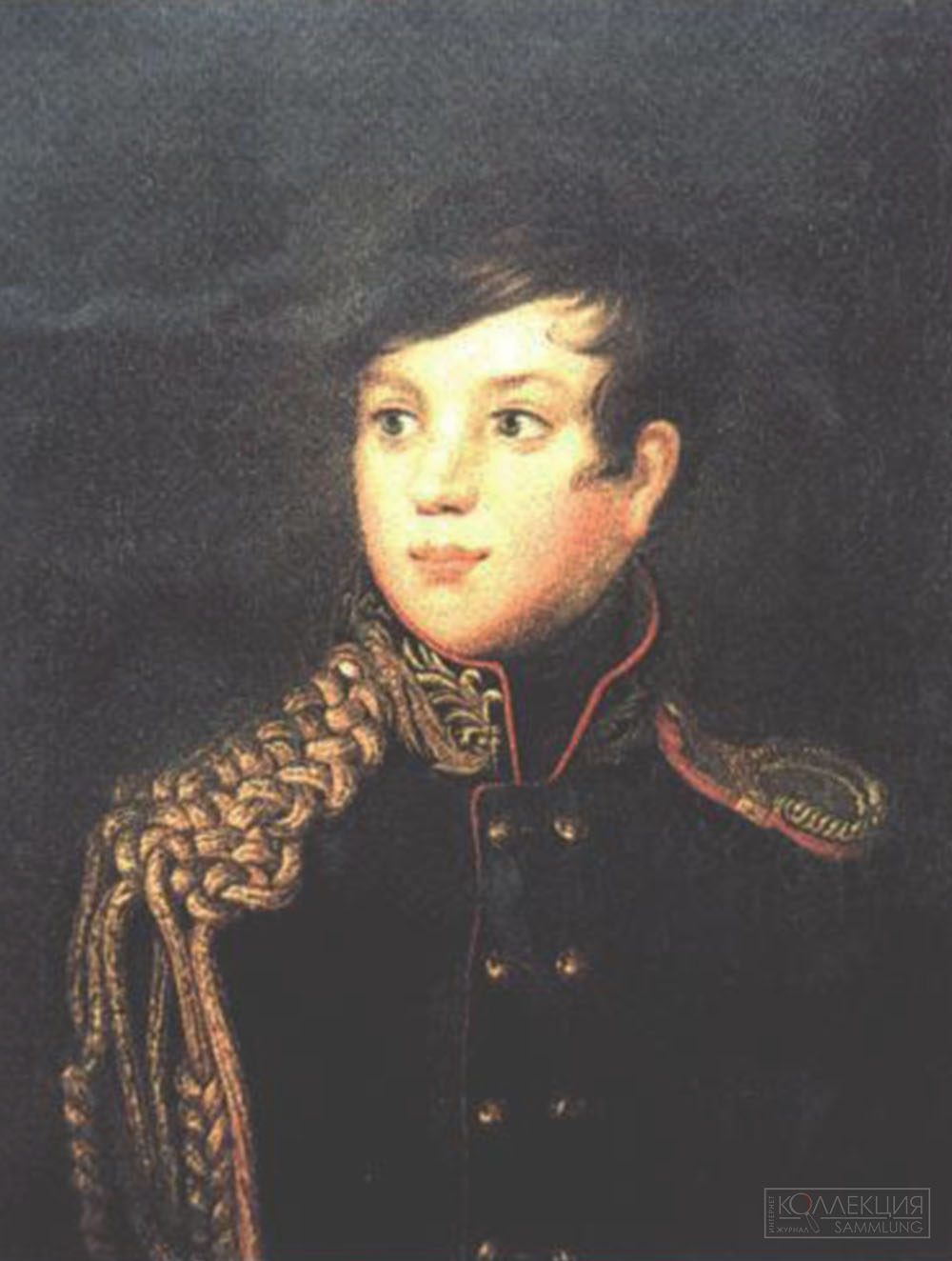 К тому времени Василий Демут-Малиновский, столь обязанный Строгановым своей карьерой и работой с Андреем Воронихиным, получил возможность выставить исполненный им в неизвестном нам году мраморный бюст графа Александра Павловича. Он был создан по не дошедшему до нас гипсовому портрету Луи-Мари Гишара, который портретировал А. П. Строганова в 1807-1808 годах в возрасте примерно двенадцати лет.[27] До настоящего времени, кроме скульптурных, мы знали о существовании трёх живописных портретов Александра: кисти Ж.-Л. Монье (1805, ГРМ), А. Варнека (1812, ГЭ) и С. Свинцова (1810-е, ГМП), причём последнее кажется созданным на основе работы французского мастера. Возможно, существует и четвёртая картинка, изображавшая совсем юного графа.[28]