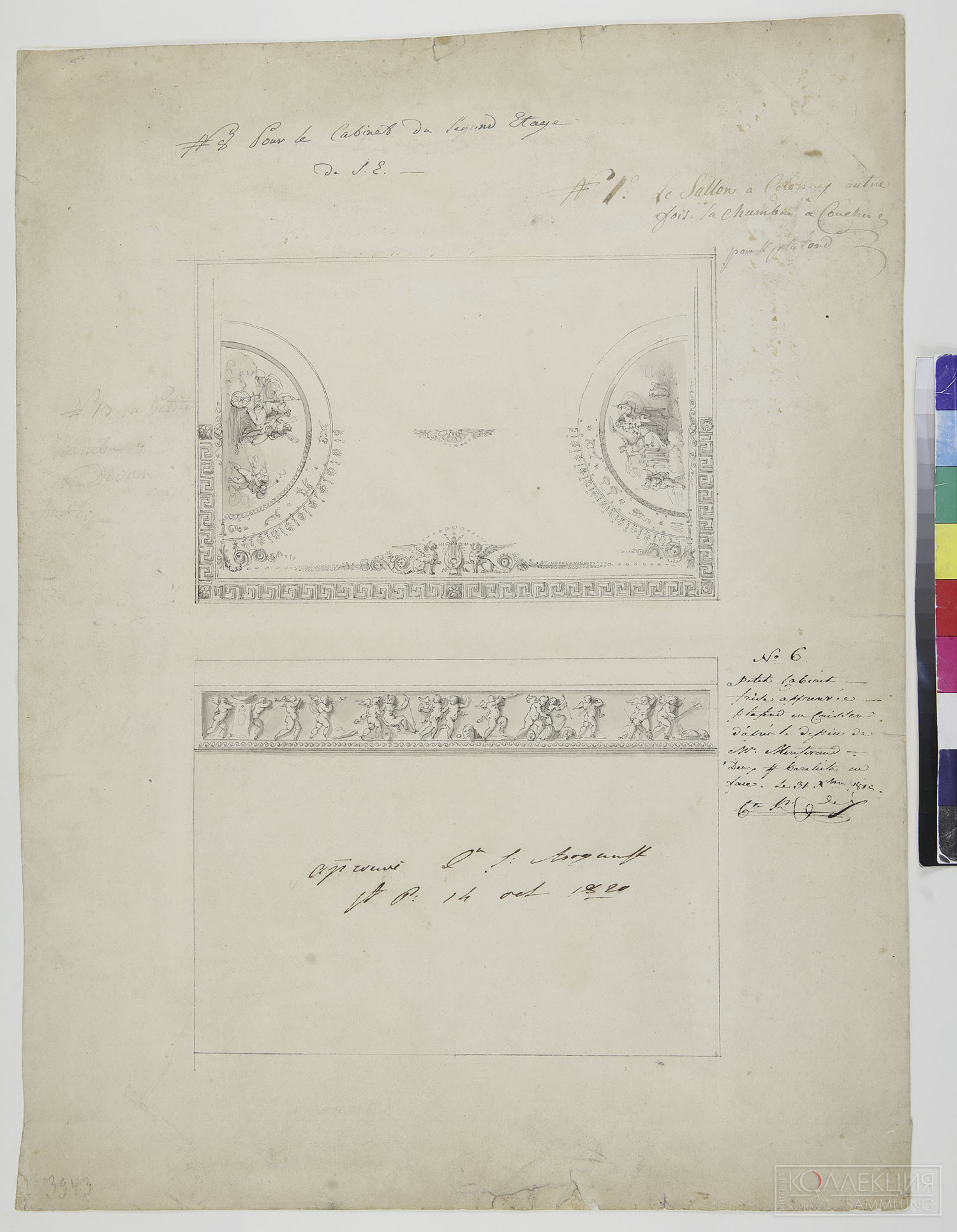На листе размером 47,3х36 находится два рисунка и множество французских надписей, которые лишь приоткрывают замысел. На первом (размером 55х84) — представлен плафон. Самая верхняя, авторская, надпись гласит: «№ 8 Pour le Cabinet de second etage de S. E.» (для кабинета второго этажа Его Сиятельства). Чуть ниже и правее архитектор поясняет: «№ 1 Le Sallon à Colonnes autre fois la chamber à coucher pour la plafond» (За с колоннами, другой вариант, спальная комната, для плафона).[36]
