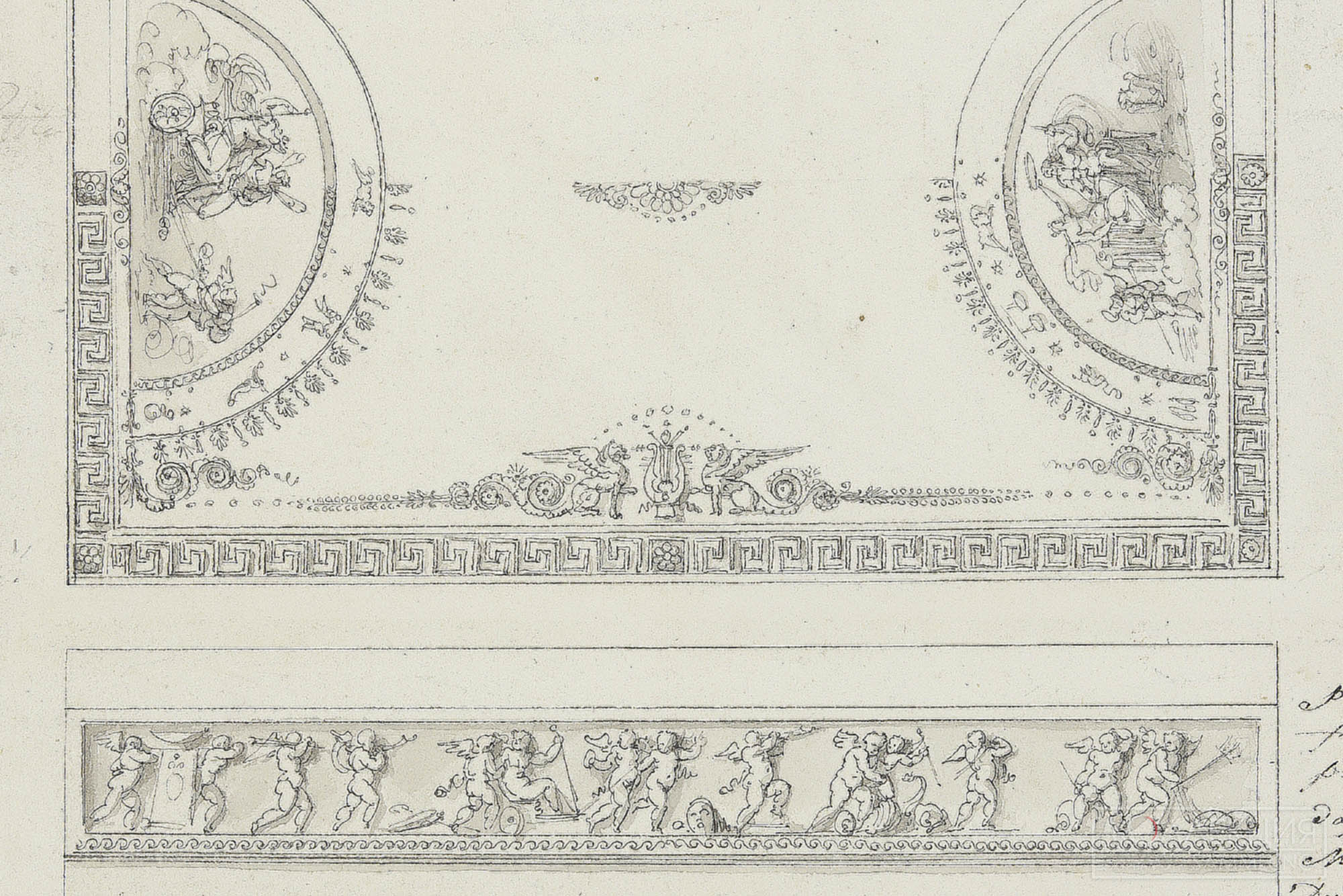 Второй рисунок (размером 58х84) показан барельеф фриза, а под ним: «Aprouve Cte Stroganoff StP 14 ост 1820», то есть, Сергей Григорьевич одобрил этот рисунок в Санкт-Петербурге в день помолвки сестры Аделаиды! Справа его же, судя по всему, пояснение: № 6 Petit cabinet frise approuvée plafond en caissons d’apres le dessin de M-r Monferand. Deux bareliefs en face le 31 decembre 1819 C-te… (Малый кабинет с утверждённым фризом и кессонным потолком, созданный по проекту г-на Монферана. Два рельефа напротив).[37] Таким образом, и в этом случае Строганов-зять, соревновавшийся с графиней в открытии учебных заведений, выступил конкурентом Софье Владимировне, в сотрудничестве с создателем нового Исаакиевского собора. Судя по надписям и самим, апартаментов было несколько, они располагались, как минимум, на двух этажах, а декорации перекликались с замыслом Росси для новой четы Голицыных.