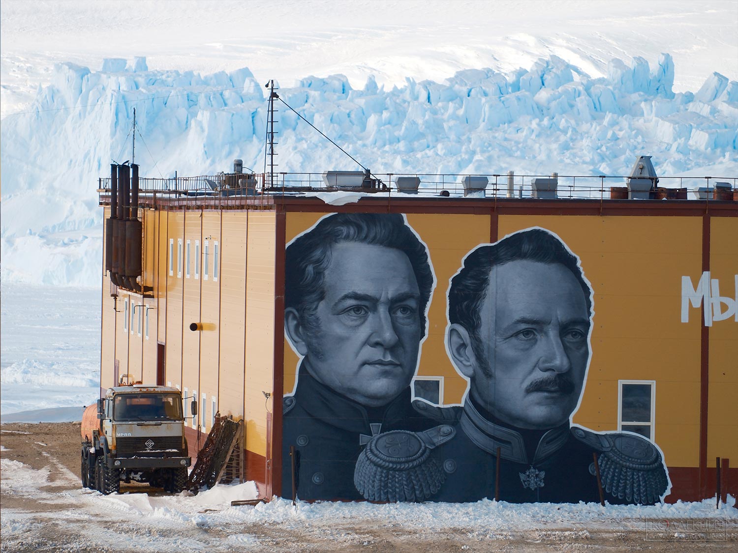 Теперь они покоряют Антарктиду. Там, на фасаде здания на территории станции Прогресс, куда творческая группа пришла морем из ЮАР и влилась в отправившуюся ранее 71-ю Российскую Антарктическую экспедицию (РАЭ) НИИ Росгидромета, постепенно появляется большой рисунок общей площадью около ста квадратных метров. Эскиз утрясался и согласовывался с различными инстанциями очень долго и в итоге был принят в такой редакции: слева направо, в полупрофиль – два черно-белых портрета российских морских офицеров Михаила Петровича Лазарева и Фаддея Фаддеевича Беллинсгаузена. На груди у каждого хорошо просматривается награда: первооткрыватели Антарктиды были удостоены высоких чинов и орденов за выдающуюся экспедицию 1819–1821 гг., осуществленную на шлюпах «Восток» и «Мирный». Этот временной промежуток также обозначен на стрит-арте. Центральную часть панно занимает большая надпись: «МЫ ОТКРЫЛИ ЗЕМЛЮ!».