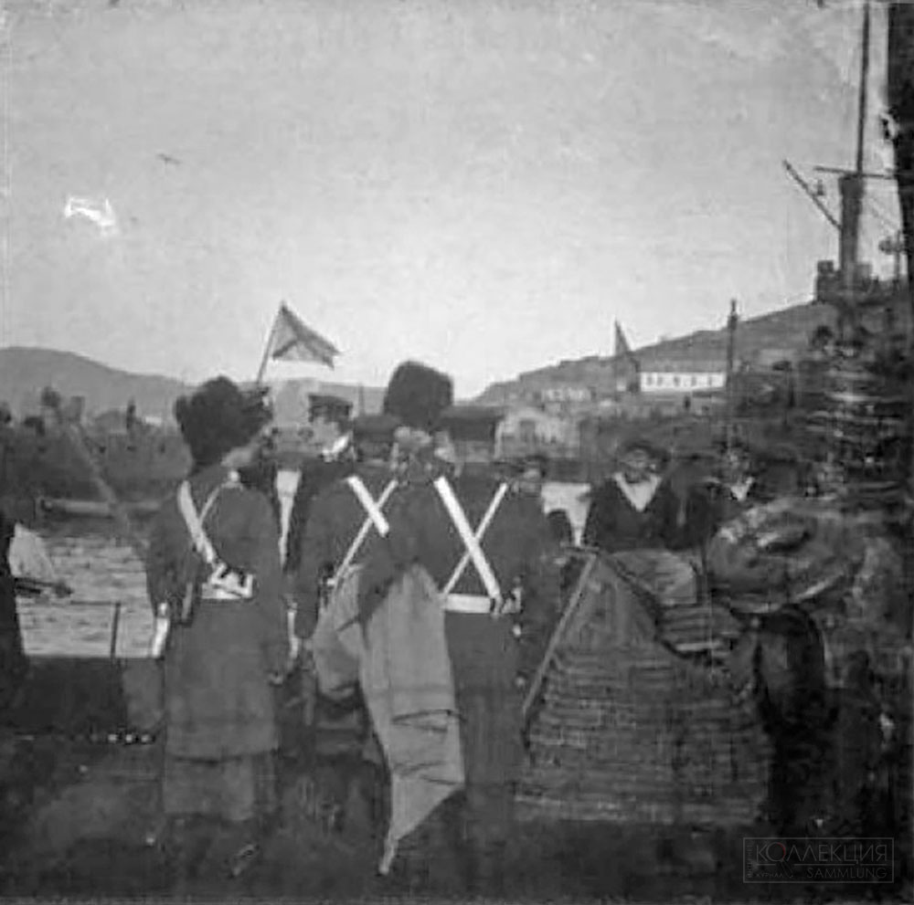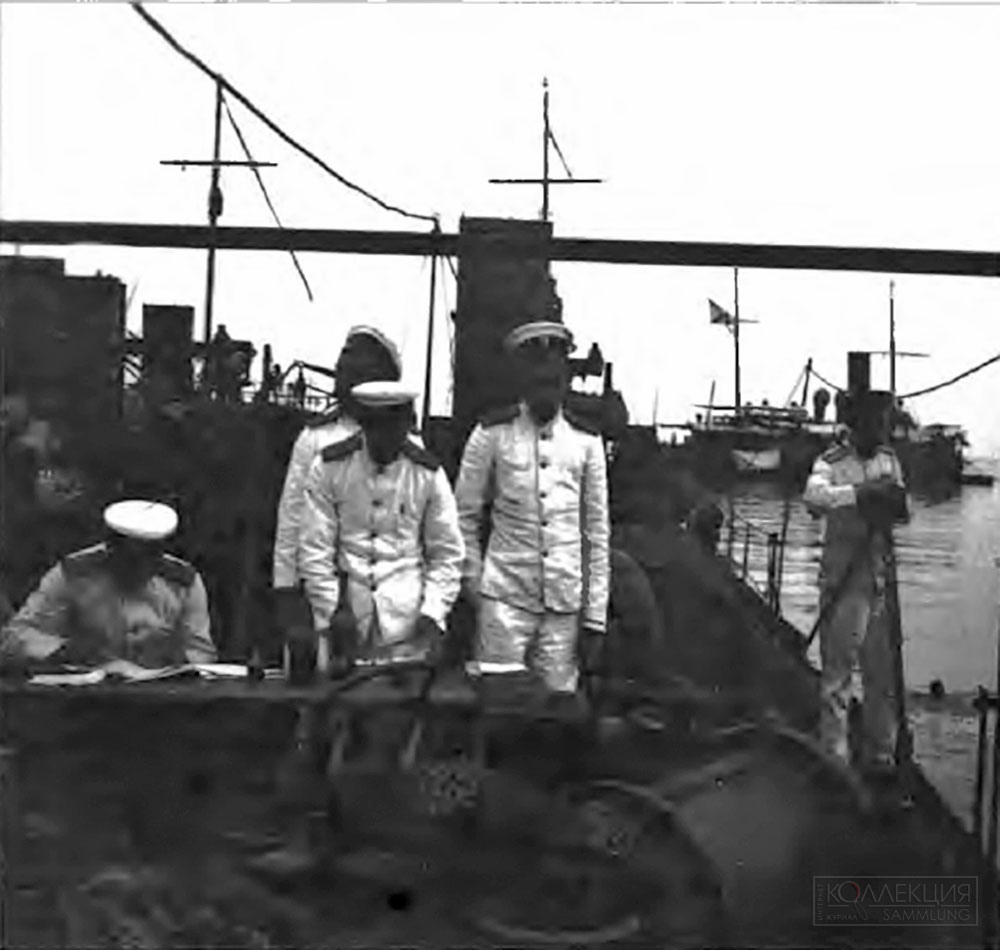 - Великий князь Кирилл Владимирович с сопровождающими лицами на палубе миноносца «Смелый». Март 1904 года. Одна из фото работ Боровского, из коллекции Центрального военно-морского музея.
