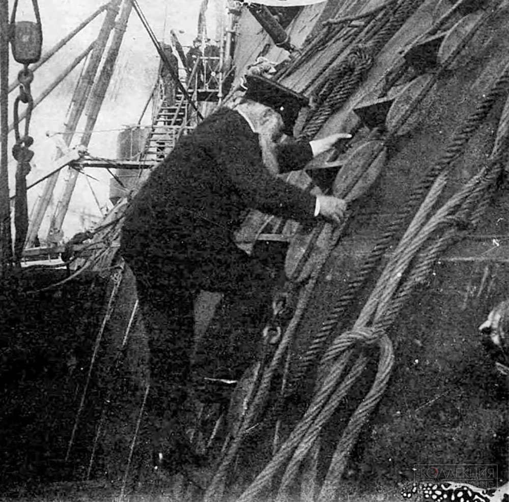 - Вице-адмирал С. О. Макаров спускается в кессон эскадренного броненосца «Цесаревич». Март 1904 г. Одна из самых известных фото работ Боровского, из коллекции Центрального военно-морского музея.