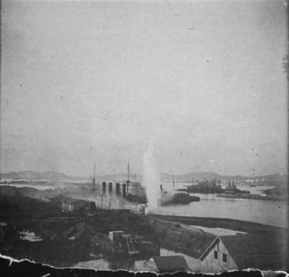 - Расстрел японской осадной артиллерией крейсера «Баян». Одна из фото работ Боровского, из коллекции Центрального военно-морского музея.