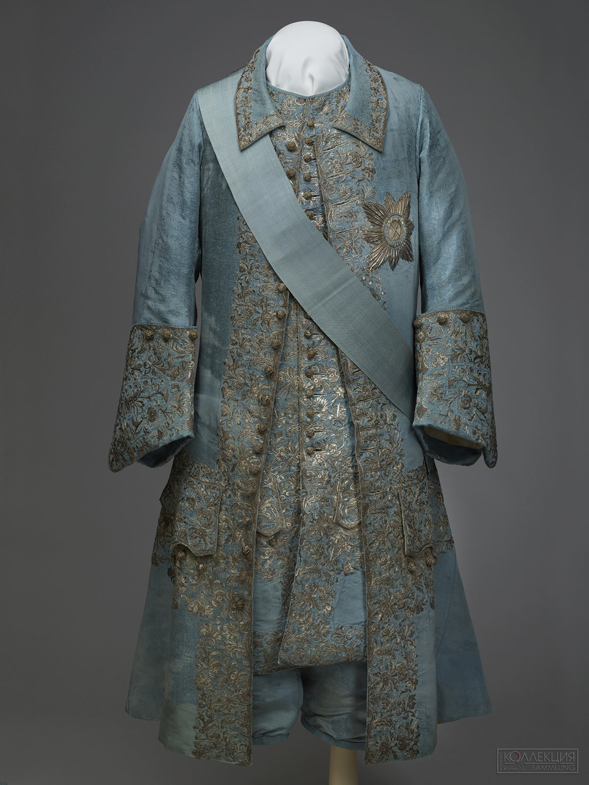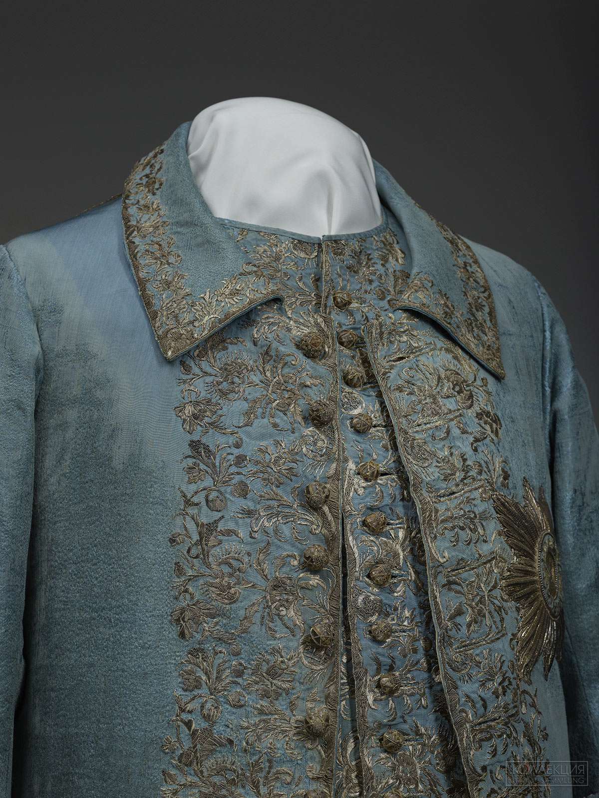 - Парадный костюм императора Петра I: кафтан и камзол. Германия (Пруссия), Берлин, 1724. Гродетур, тафта, холст, шерстяная ткань, серебряные нити, канитель, дерево (основа пуговиц), бумага (основа шитой орденской звезды), чернила; серебрение, вышивка, плетение. Государственный Эрмитаж. В этом костюме император Пётр I присутствовал в Москве на коронации своей супруги Екатерины I в мае 1724 года