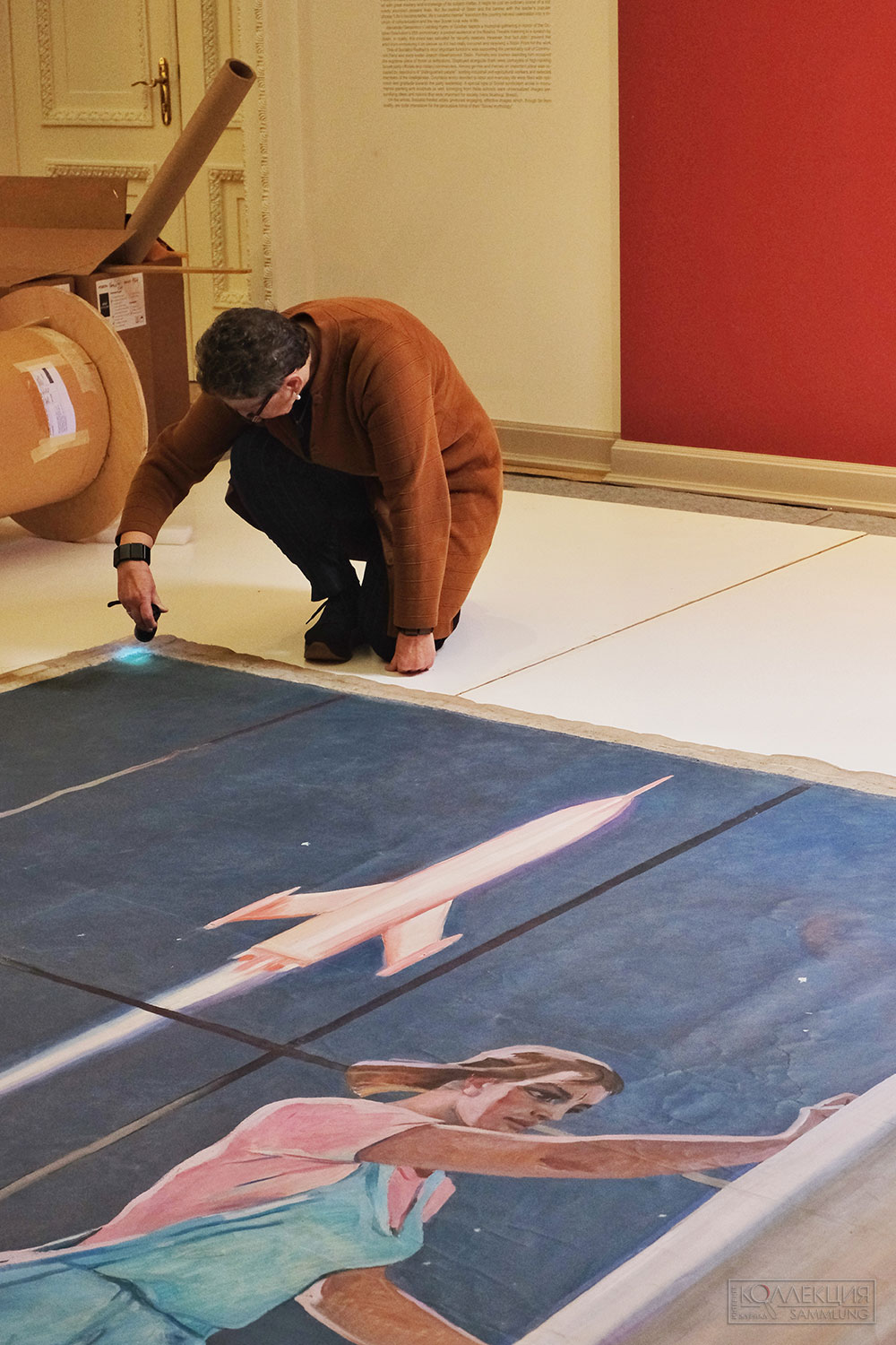 Посетители корпуса Бенуа Русского музея могли наблюдать за процессом реставрации «Покорителей космоса» через стеклянную перегородку зала открытой реставрации (№ 86).