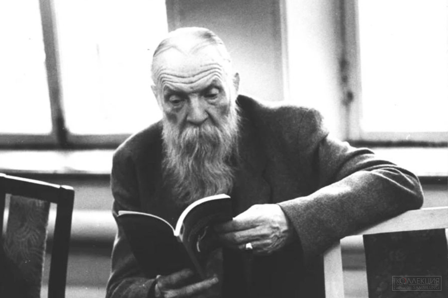 В итоге мы остановились на том, который был сделан с известной фотографии, где Никита Ильич сидит на стуле, одним локтем облокотившись на спинку и листает страницы книги.