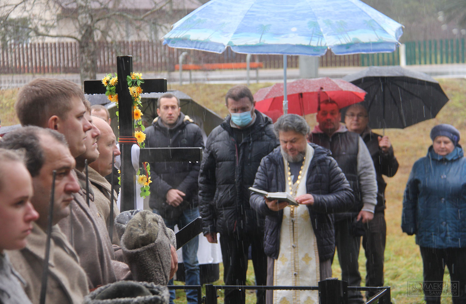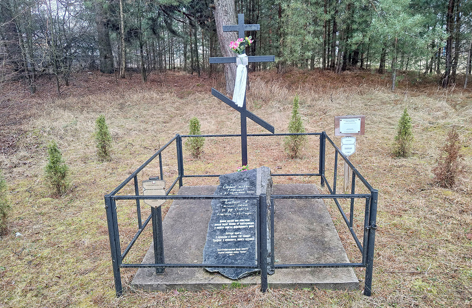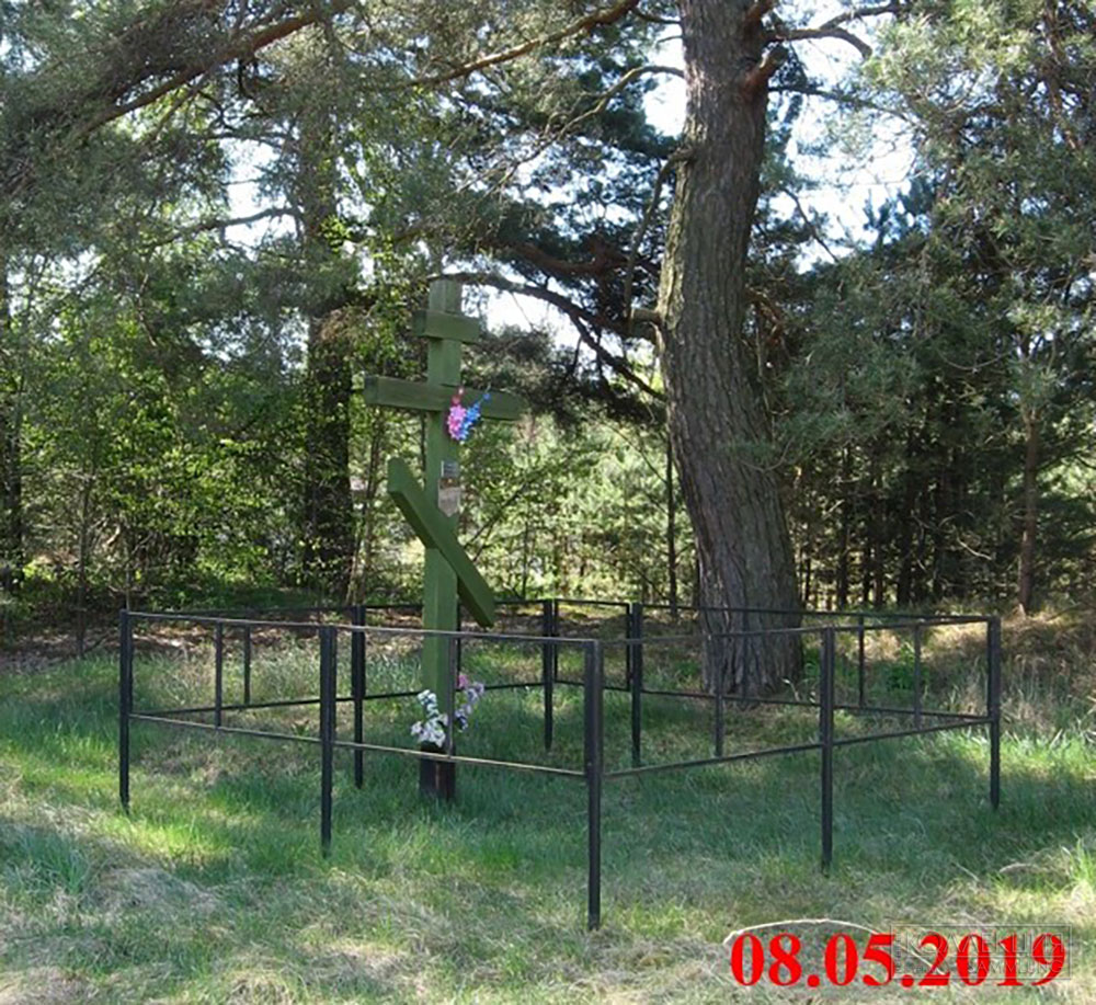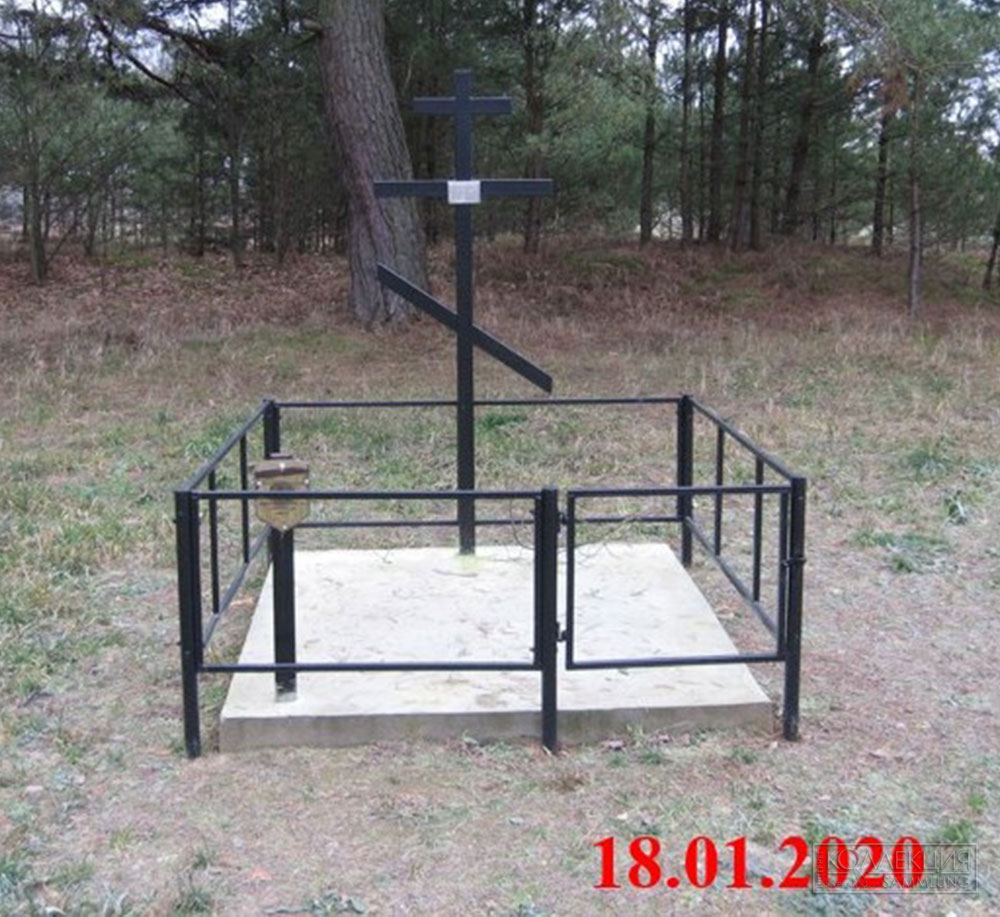 Вместе с Цитовичем Борисом Борисовичем, создателем фонда «Крокi» и художником-графиком по профессии, мы снова отправились на место захоронения. Только в этот раз мы обнаружили тут памятный знак в виде креста обнесённого металлической оградой.