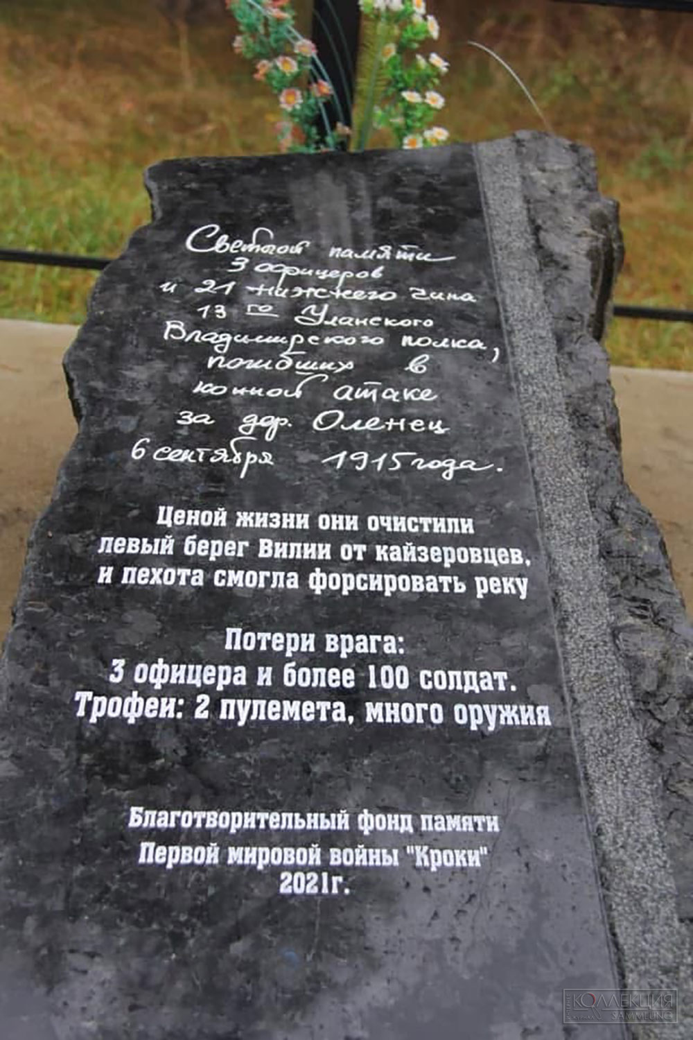 В этом году исполняется 110 лет Виленской оборонительной операции, которая также широко известна как ликвидация Свенцянского прорыва. В ходе этой операции произошло много боёв местного значения, в некоторых из них подразделения Русской императорской армия показали храбрость и отвагу. Многие солдаты и офицеры были удостоены Георгиевских наград. Одним из таких боёв является конная атака 3-х эскадронов Владимирских улан 6 (19) сентября 1915 года у д. Оленец. Но начнём статью с конца, с реконструкции могилы на месте боя. Почему? Просто, когда начался процесс восстановления захоронения возник вопрос, что здесь произошло и кто тут похоронен. И ища ответы на них было собрано много архивных документов об этом бое и даже обнаружены фотографии тех времён.