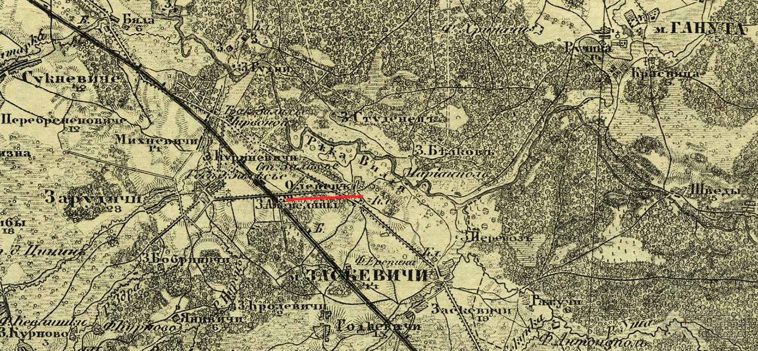 6 сентября 1915 г. Уланский полк в составе 6 эскадронов следовал во главе дивизии и около 3 ч. дня проходил лес к северо-востоку от г.д. Залесье, что на берегу реки Вилии. В это время подскакал дозорный из авангардного гусарского полка, и доложил, что в версте к востоку от нашей дороги он наткнулся на один – два эскадрона германцев. Немедленно для атаки был направлен дивизион в составе 2, 3 и 5 эскадронов под начальством подполковника Цвиленева. Эскадрон №1 был послан запереть переправу через Вилию у Марионполья, а эскадрон №6 был поставлен перед найденным бродом между Марионпольем и З. Рудня. Подполковник Цвиленев с дивизионом быстро выдвинулся по лесной дороге на деревню Оленец. В том числе 2 эскадрон, за ним 5 и 3. Когда дозоры 2 эскадрона показались на юго-восточной окраине д. Оленец противник открыл огонь по ним из опушки кустов в ½ версте от д. Оленец. Скрыв эскадроны за строения подполковник Цвиленев спешил сначала взвод 2 эскадрона под командой корнета Мевиус-Симишина и приказал ему занять юго-восточную окраину д. Оленец, для охвата ж правого фланга противника, и чтобы отрезать ему доступ к переправе через реку был двинут скрытно по кустам эскадрон №3 который выждал (слово «выждал» зачёркнуто и заменено словом «выиграв») фланг противника, спешил для обстрела во фланг взвод стрелков под командой корнета Белостоцкого. Эскадрону №5 сначала приказано было выслать взвод в лаву под командой корнета Балка чтобы вызвать огонь смешанных частей противника, обнаружить его силы, а затем 5 эскадрон спешил также один взвод под командой корнета Нечаева, для обстрела левого фланга противника. Когда огонь спешенных взводов и маневрирование лавой выяснило прилично силы противника (около 3-4 эскадронов при 4 пулемётах) подполковник Цвиленев решил атаковать германцев в конном строю, о чём предупредил командиров эскадронов. Местность от д. Оленец к лежащему к юго-востоку м. Заскевичи представляет ровную площадь, прорезанную по середине большой дорогой с глубокими канавами по ширинам. Перпендикулярно дороге тянутся ряды проходимых для конной части леса и кустарники. Этим кустарником очевидно решили воспользоваться немцы. Лихо понеслись по приказанию подполковника Цвиленева уланы в атаку. Первым бросился в атаку эскадрон №2 во главе со своим командиром ротмистром кн. Чавчавадзе, одновременно с ним охватывая фланги противника вынеслись эскадрон №3 под командой ротмистра Ганьшина, охватывая правый фланг и эскадрон №5 под командой штабс-ротмистра Будковского в охват левого фланга. Выдвинутый от 1 эскадрона с ½ эскадроном в лаву корнет Доможиров, увидев атаку товарищей, лихо бросился со своим ½ эскадроном поддержать родной полк и атаковать также в правый фланг противника. Германцы оказали геройское сопротивление. Когда эскадроны проскакали первую линию стрелков перерубив и заколов многих, тогда оставшиеся в живых германцы и часть их, бывшие несколько впереди, собрались снова кучками и открыли частый и меткий огонь в тыл наших эскадронов. Уланы поворачивали назад и дорубливали стрелявших. Германцы последовательно от одной группы кустов перебегали к другой направляясь к переправам. Уланы безостановочно их преследовали. Ни страшный огонь ружейный ни безостановочная работа 4 пулемётов не могла остановить атаку Владимирских уланов. Меткий огонь 