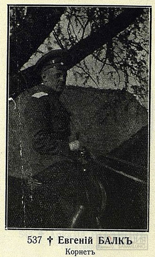 Одним из этих выстрелов в грудь на вылет был убит корнет Балк, павший после того, как командуя небольшой частью, энергичной атакой заставил коноводов выпустить лошадей, которые тотчас же разбежались, и тем оказал незаменимое содействие успеху своей части, уничтожившей всех спешенных чинов 7-го конно-егерского полка.