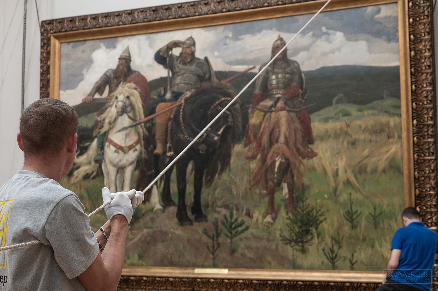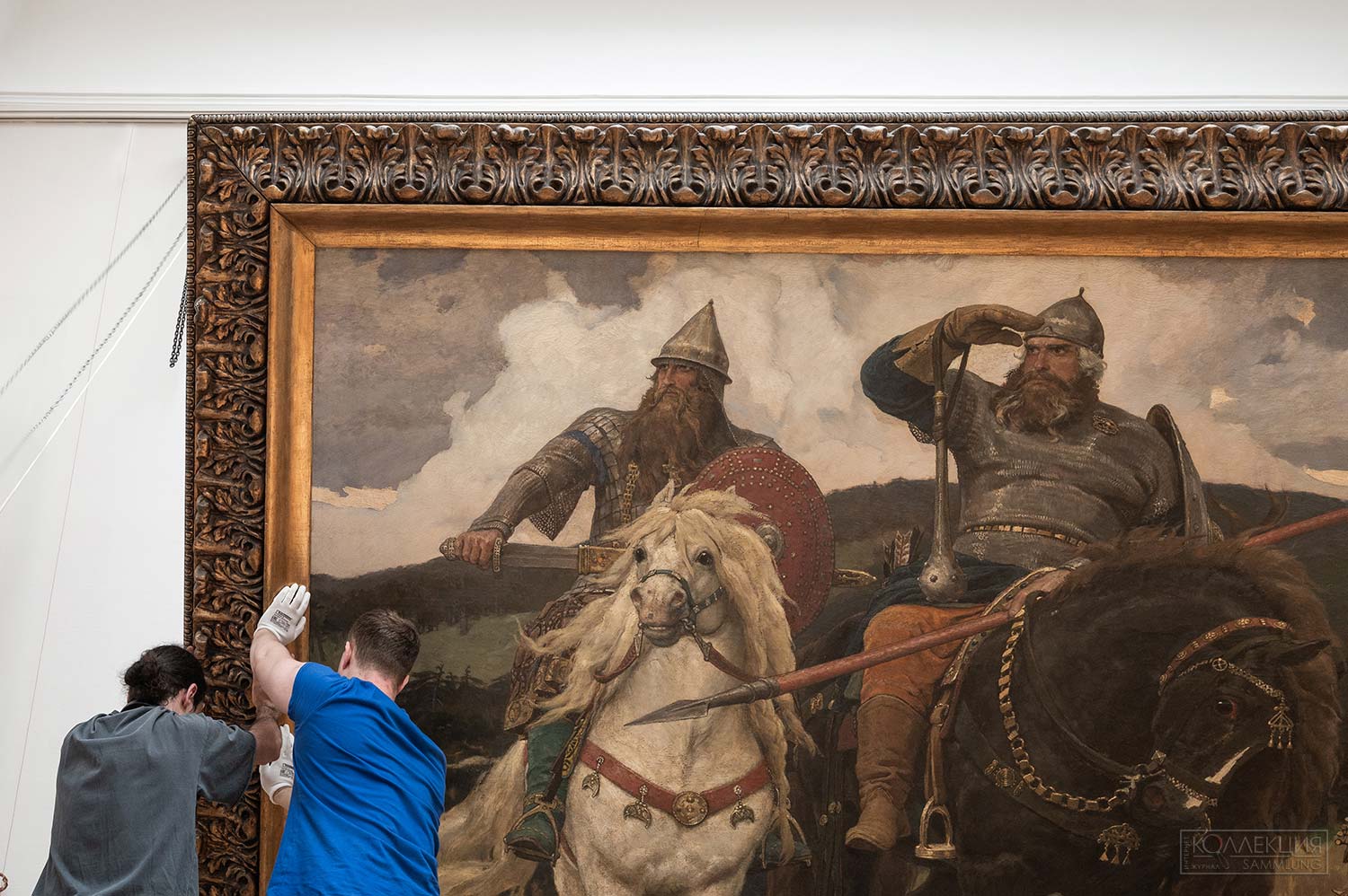 В июне 1898 года, после завершения работы, монументальную картину приобрёл Павел Третьяков. «Богатыри» были помещены в большом зале на втором этаже Галереи, где находятся и сейчас. Процесс монтажа включает отдельную сборку масштабной исторической рамы. В течение нескольких дней многослойная живопись будет «приспосабливаться» к климатическим условиям после переезда из Санкт-Петербурга.