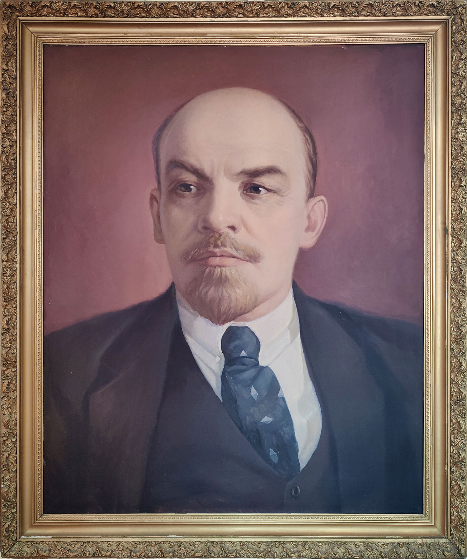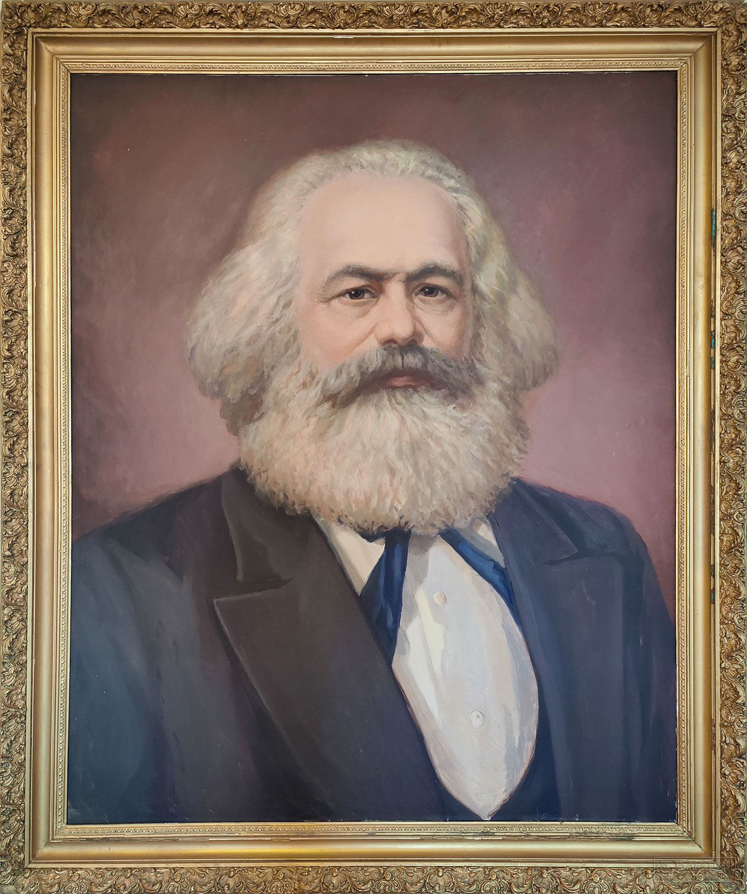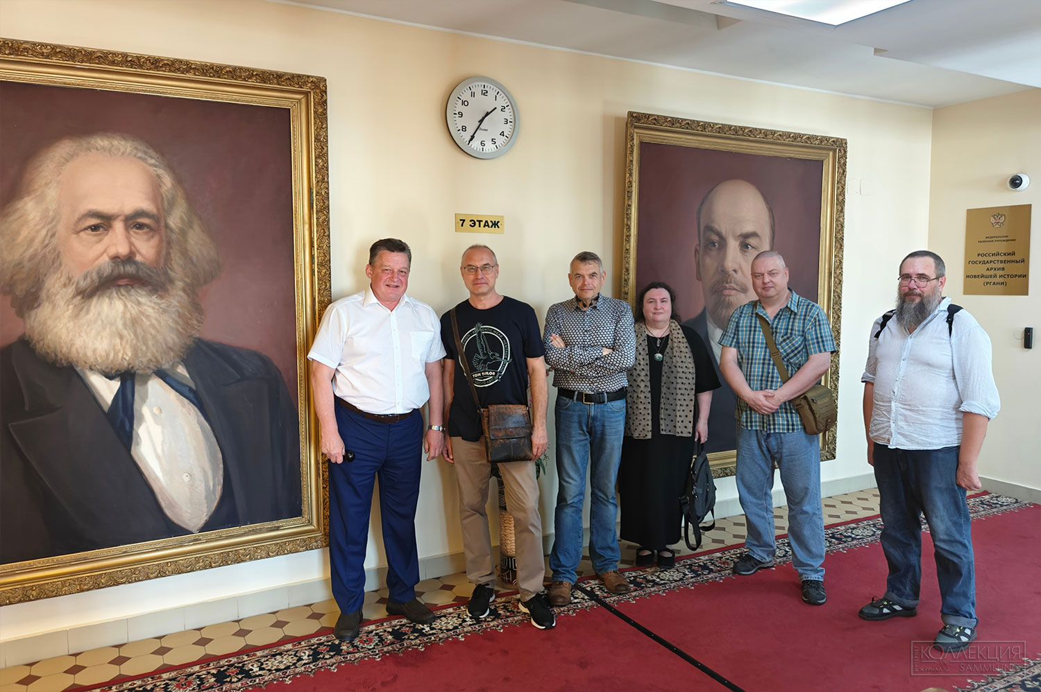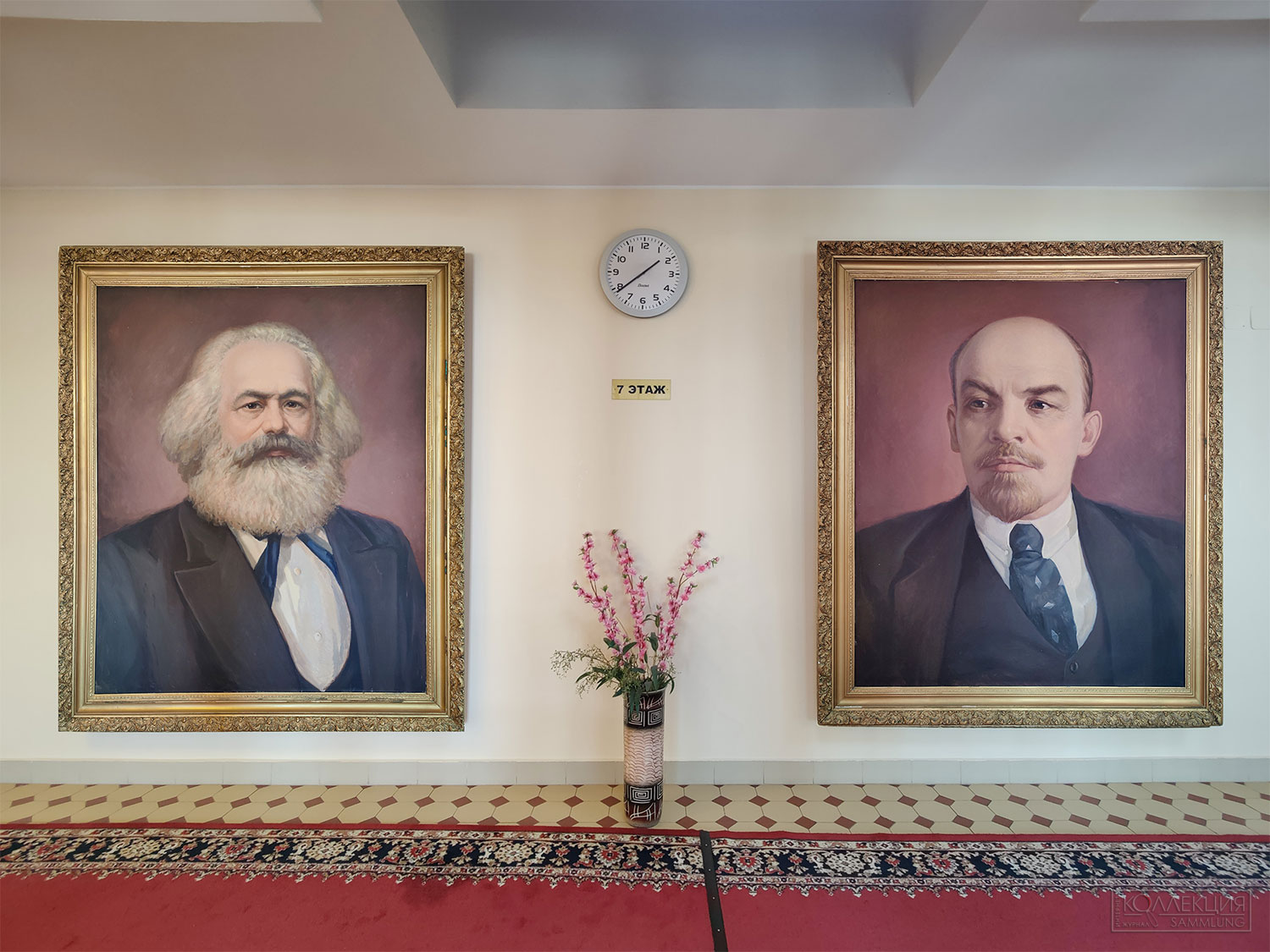 Прежде чем спустится в хранилище потребовалось миновать лестничную площадку, украшенную портретами Карла Маркса и Владимира Ильича Ленина. Размер их нешуточный и ставит в тупик всех их увидевших – сегодня пронести их в здание просто нереально. История их появления такова — когда РГАНИ переезжал с прошлого места размещения, то руководство архива запросило разрешение забрать с собой и эти два изображения, висевшие в зале на Ильинке. После получения положительного решения оказалось, что вынести через дверные проёмы картины такого большого размера совершенно нереально. Пришлось задействовать автокран и транспортировать их через оконный проём. А когда привезли в новое здание, то просто повезло, что в нём полностью не окончился ремонт. Поэтому снова через окна, через лестничный проём портреты и другие крупногабаритные вещи подняли и разместили по местам.