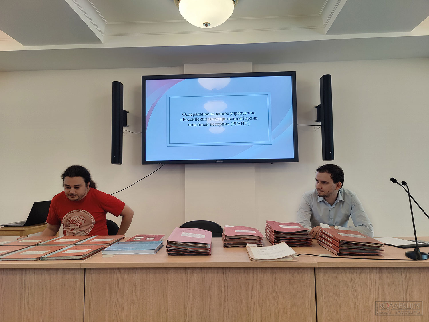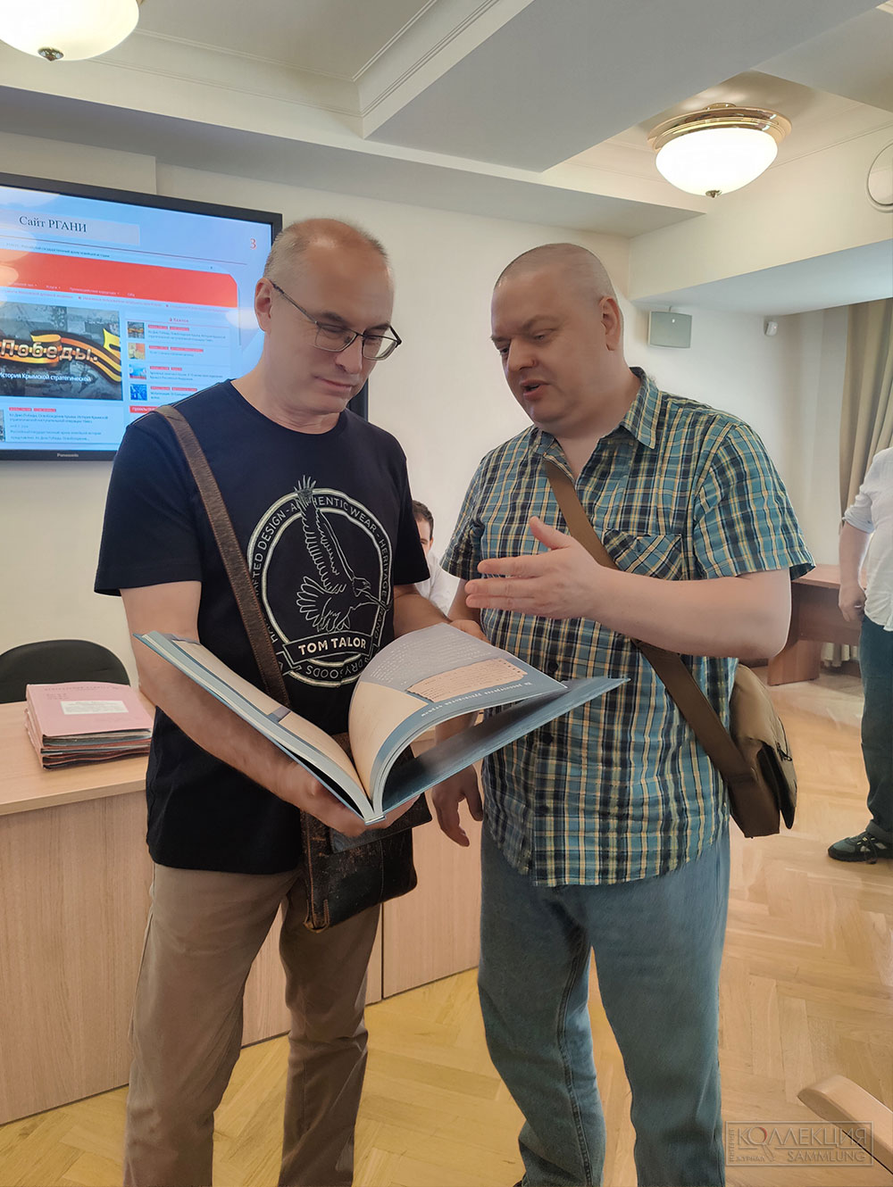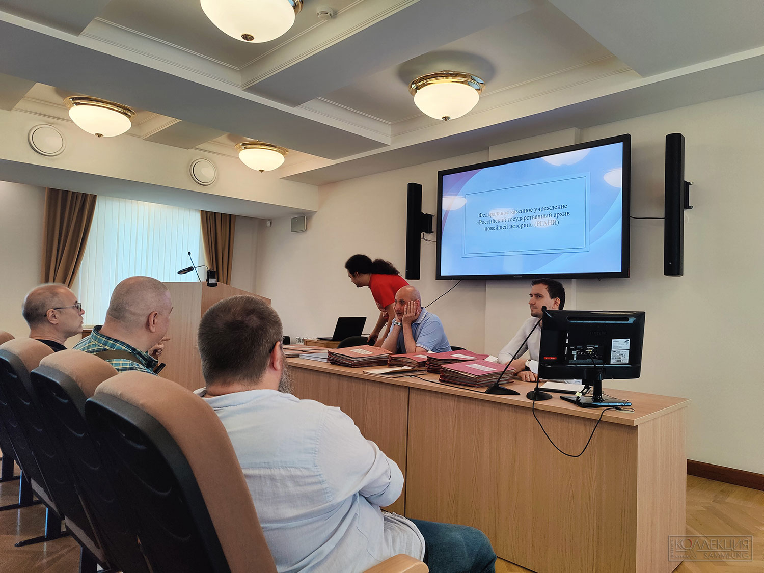 И, конечно же, РГАНИ, развивая и увековечивая свои деятельность, публикует и издаёт научные сборники по всем правилам археографии и научных инструментов. Приятной неожиданностью явилось то, что дизайнером книг и видео является присутствовавшая на встрече Анастасия Тюрина.