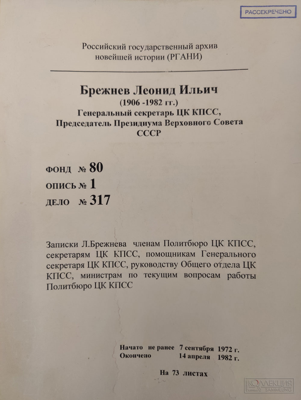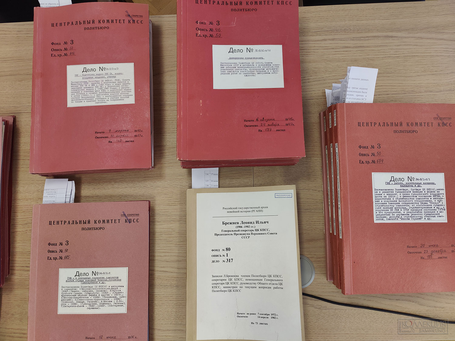 От журнала «Коллекция» добавим, что нам повезло и мы смогли узнать не только об основных моментах существования архива. Нам также разрешили ознакомиться с рядом документов из фонда Политбюро ЦК КПСС, которые попали на хранение как раз благодаря передаче документов из архива Президента РФ. В их числе в архив переданы фонды личного происхождения высших руководителей партии – Брежнева, Андропова, Горбачева, Хрущёва, Черненко.