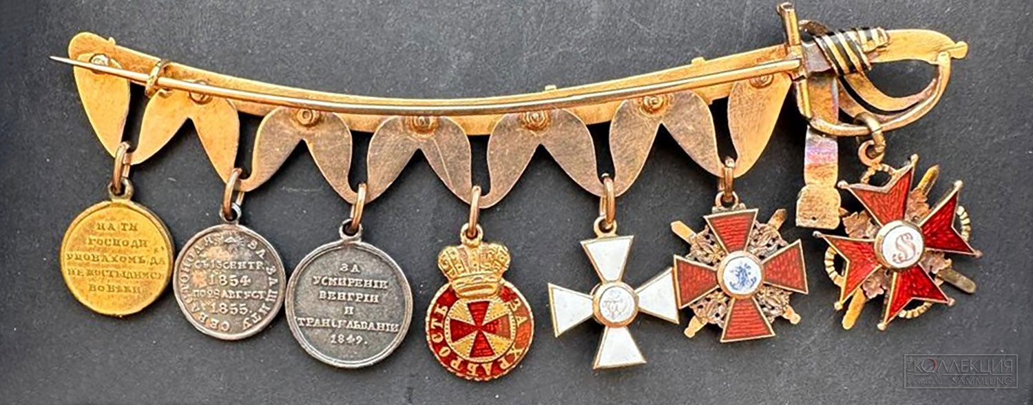 На колодке присутствуют следующие награды: Орден Святого Станислава 2-й или 3-й степени с мечами, Орден Святой Анны 3-й степени с мечами, Прусский орден Красного Орла предположительно 3-й степени, Орден Святой Анны 4-й степени с надписью «За храбрость», Серебряная медаль «За усмирение Венгрии и Трансильвании» (лента комбинированная Андреевско-Владимирская), Серебряная медаль «За защиту Севастополя» (лента Георгиевская), Бронзовая медаль «В память войны 1853—1856» (лента Андреевская).
