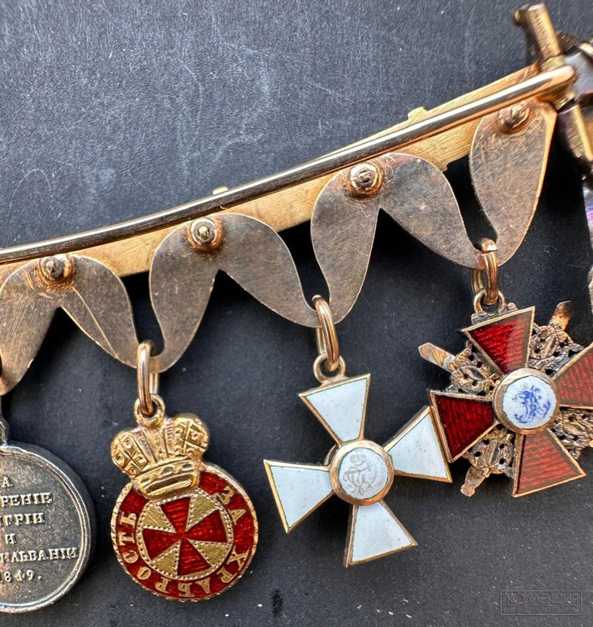 В колодке сразу бросается в глаза ношение иностранного ордена в нарушение правил. По «Правилам ношения наград Российской империи» иностранные награды носятся после всех орденов и медалей Российской империи. Но на колодочке Орден Красного Орла расположен между орденами Анны 3 и 4 степеней. Наличие на миниатюре награды эмали говорит нам, что Орден Красного Орла у кавалера был скорее всего 3-й степени без мечей. У Ордена Красного Орла 4-й степени лучи не покрывались эмалью. Орден Красного Орла 2-й степени был двух видов со звездой и без, крест покрытый эмалью носился на шее. Расположение ордена после Ордена Св. Анны 3-й степени, и перед Орденом Св. Анны 4-й степени, говорит о том, что это Орден Красного Орла 3-й степени.