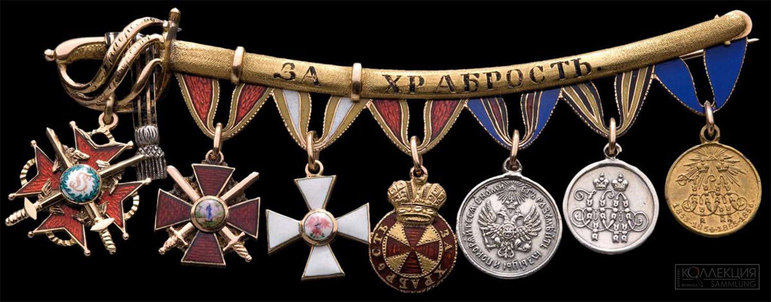 Выходит, орден Святой Анны 4 степени с надписью: «За храбрость» он получил за поход в Венгрию, Золотую саблю с надписью: «За храбрость» за Севастополь и был награждён всеми тремя медалями которые представлены на колодке. Получается у него точно есть 5 наград из восьми искомых. Осталось найти данные о награждении фон Рённе тремя другими орденами.