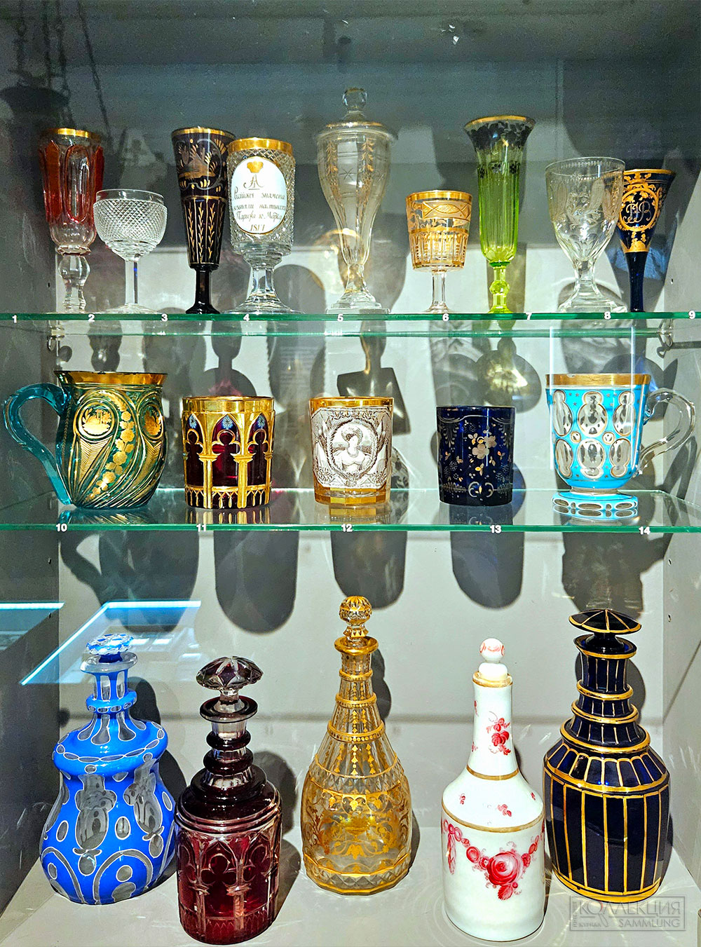 Жемчужинами коллекции стекла являются двустенный стакан работы крепостного мастера Бахметевского стеклянного завода А. Вершинина, графин французской фирмы Гале, а также редкие образцы микромозаики первой трети XIX в. круга Г. Веклера и аксессуары, искусно украшенные бисерным шитьём и вышивкой.