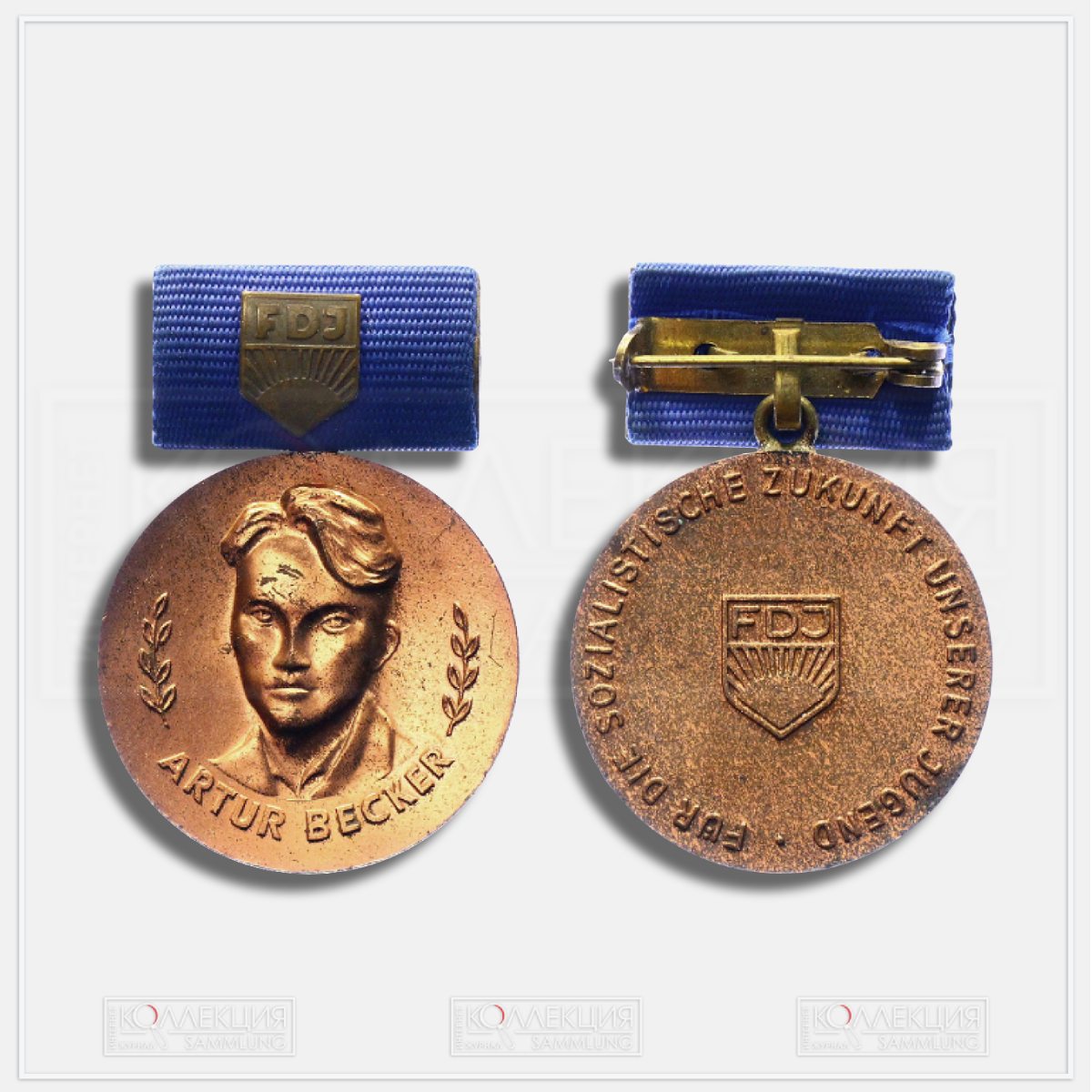 Синяя лента с металлическим бронзовым щитком «FDJ» — Медаль Артура Беккера III степени (нем. Artur-Becker-Medaille) — высшая награда Союза свободной немецкой молодёжи ГДР (нем. Freie Deutsche Jugend, FDJ). 3-я степень (бронза) является младшей среди трёх степеней. Об этой награде мы писали, как об аналоге советского Почётного Знака ВЛКСМ.