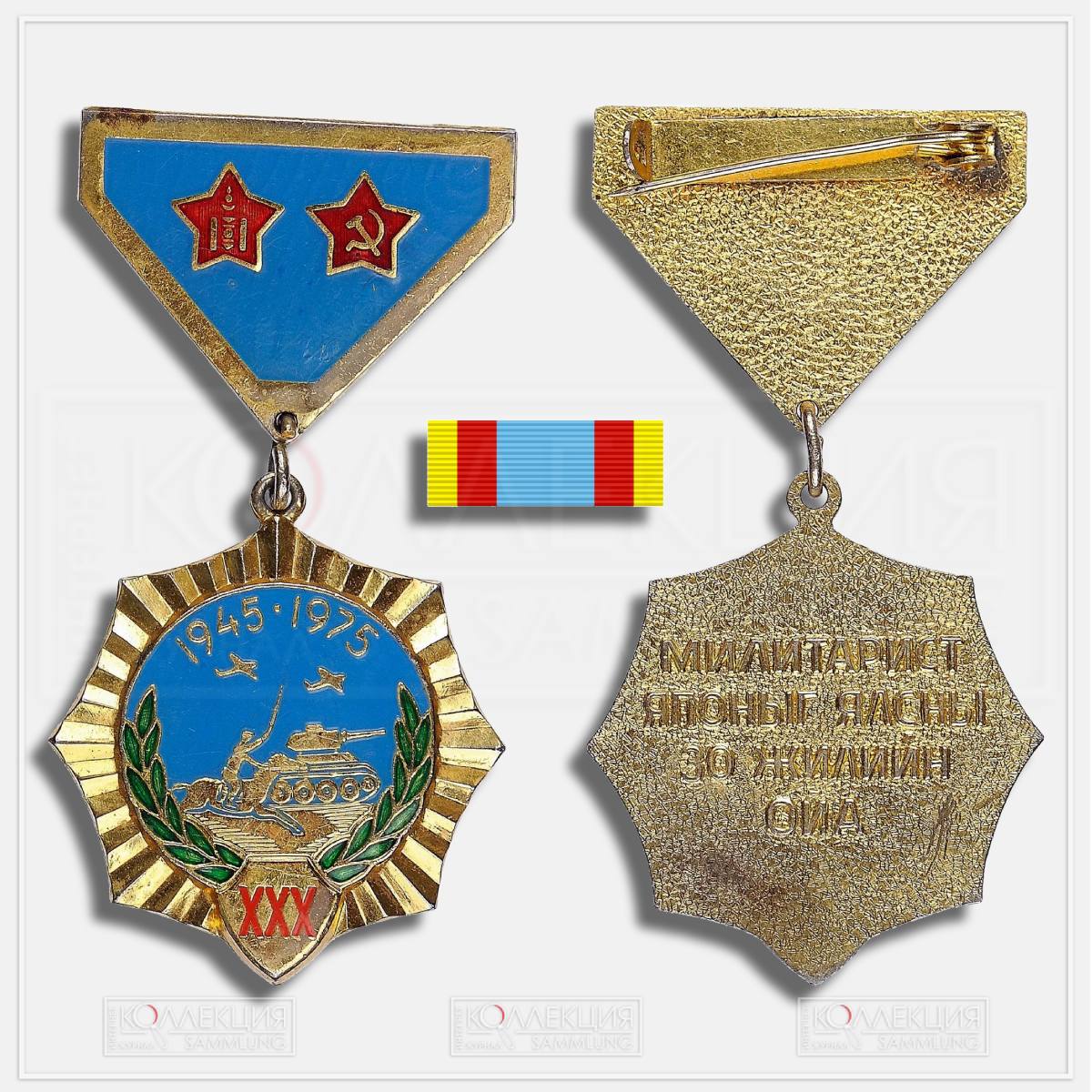 Медаль «30 лет Победы над милитаристской Японией» с помощью ушка и кольца соединяется с пятиугольной колодкой, покрытой голубой эмалью. На колодке изображены две красные пятиугольные звезды. Звезда слева эмблема Монгольской Народной Армии, звезда справа — эмблема Советской Армии. Лента же медали красно-жёлто-голубая никак не может выдать принадлежность к этой награде, только если её не знать.