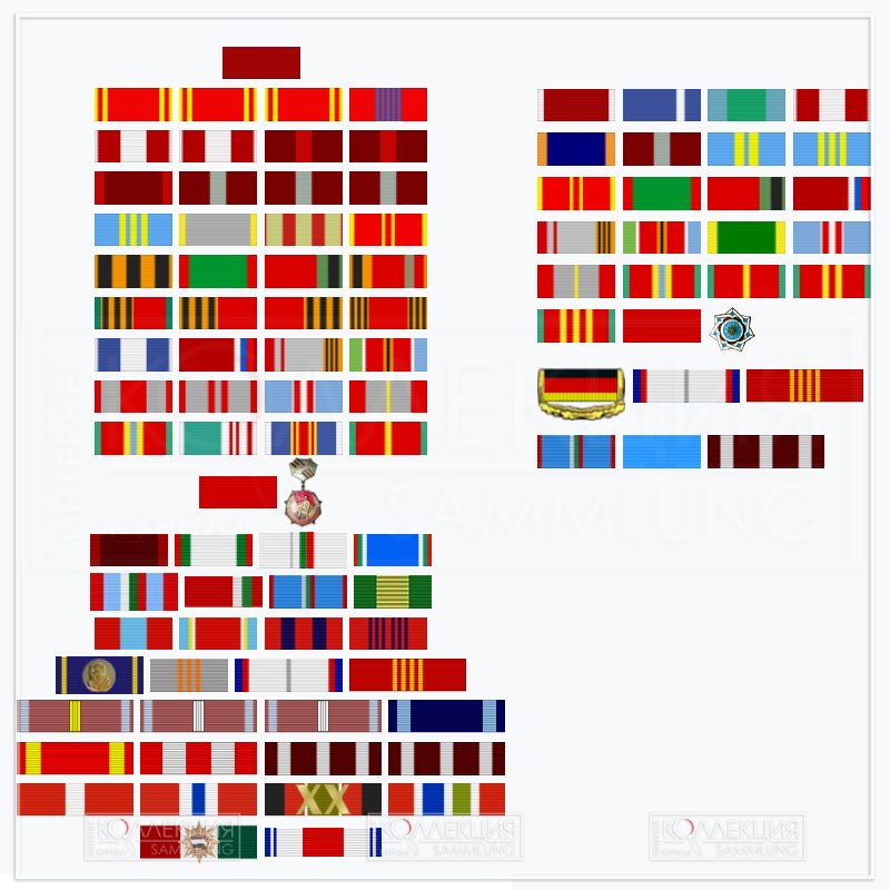 Ещё одна синяя лента вызвала затруднения. Есть предположение, что это могли быть награды Совета Мира ГДР: Медаль мира, или Знак отличия Совета Мира.