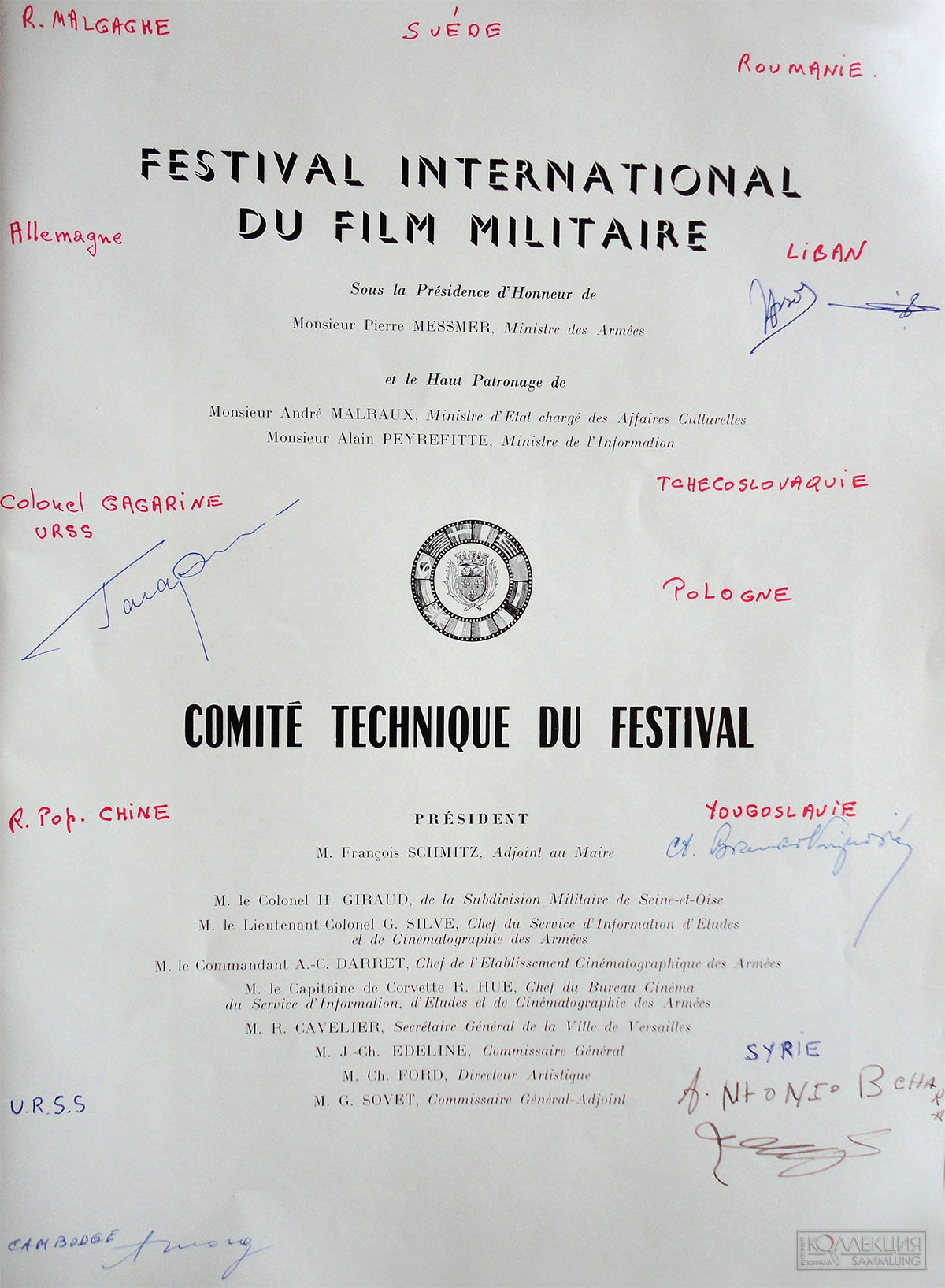 - 1965 г. Июнь месяц. Обложка каталога Фестиваля военного фильма во Франции (г. Версаль), где я был назначен переводчиком русского языка при разных Восточных делегациях, которые представляли свои фильмы на конкурс. В дни закрытия и награждения призами, приехал Лётчик-космонавт Юрий Алексеевич Гагарин, который совершал своё «европейское турне» Я так с ним и познакомился в этот день.