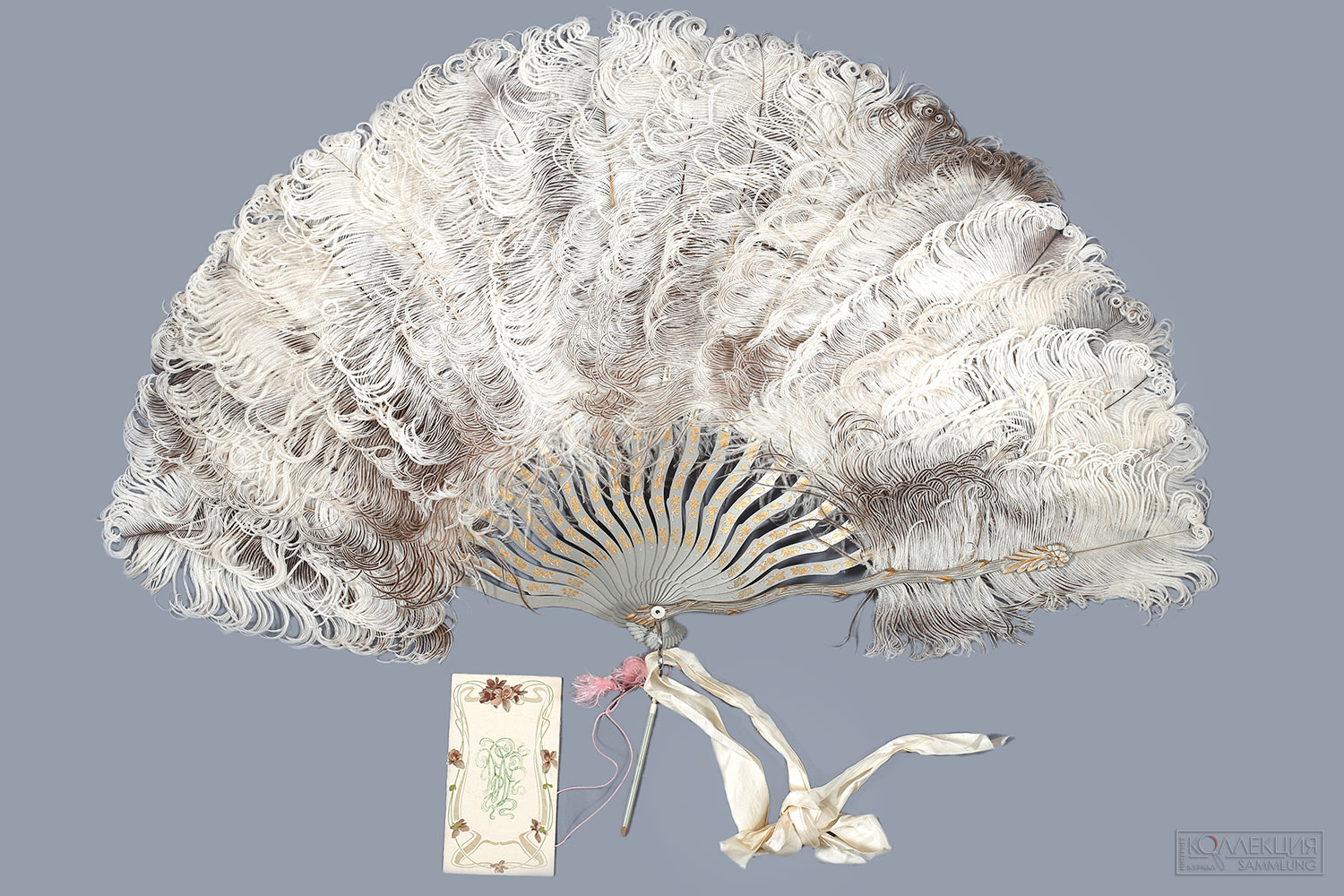 - Веер из страусиных перьев с программой бала и карандашом. Экран: страусиные перья. Остов: резьба по перламутру, золочение, металл, шёлковая лента. Размеры: 38 х 60 см. Антикварный Салон «На Патриарших»