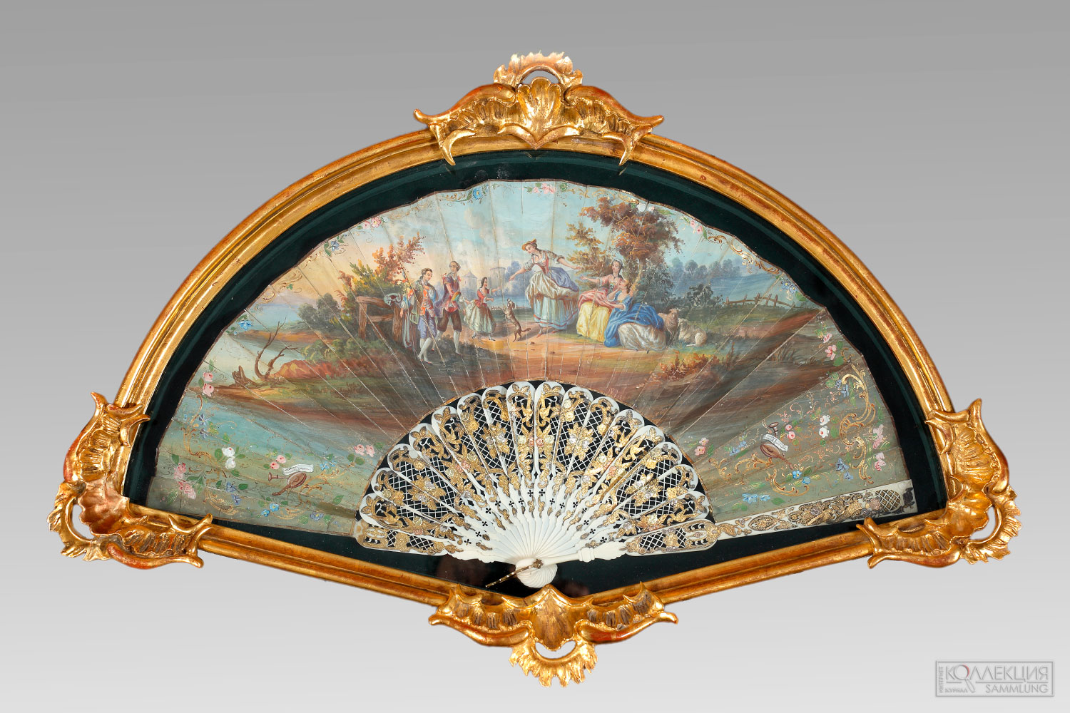 - Веер с галантными сценами на фоне сельского пейзажа Франция на сером фоне Меанд Антик. Вторая половина XVIII века. Экран: бумага, гуашь. Остов: слоновая кость, резьба, инкрустация фольгой. Размеры в футляре: 41.5 х 62 х 6 см