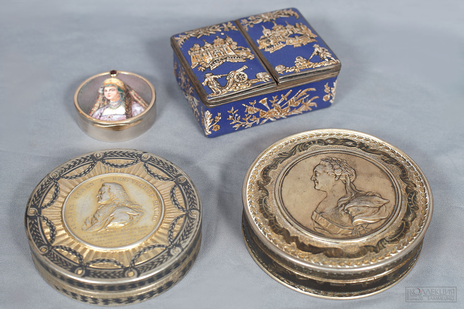 Шкатулка с портретом Екатерины II. Россия, Санкт-Петербург. 1800-е годы. Мастер: Кохендёрфер Бернгард Иоганн (Kochendörfer Bernhard Johann) (1780-1865). Серебро, литьё, чеканка, гравировка, чернь. Размеры: Высота 2 см, Диаметр 9,5 см. Галерея «Меандр-Антик».