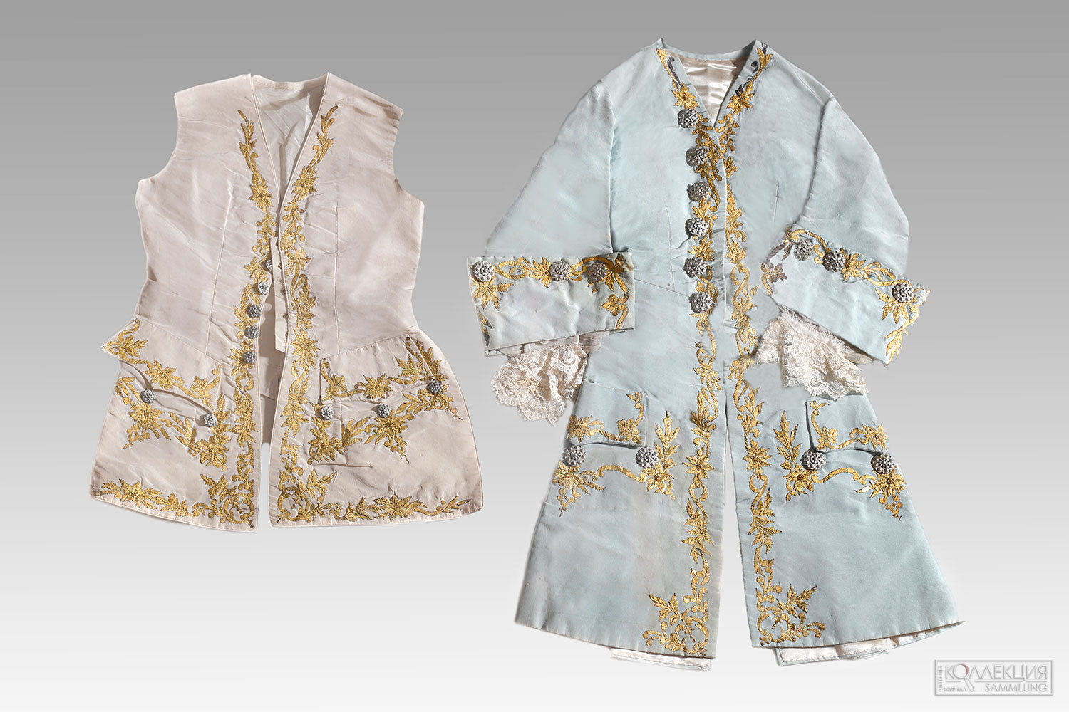 - Сюртук и жилет Франция, около 1770-1780 гг. Жилет из белого шелка, декорирован яркой золотой цветочной вышивкой. Франция, около 1770-1780 гг. Шёлк, пуговицы — серебро. Галерея «Меандр-Антик». Сюртук голубого цвета, декорирован яркой золотой цветочной вышивкой. Франция, около 1770-1780 гг. Шёлк, пуговицы –серебро. Галерея «Меандр-Антик»
