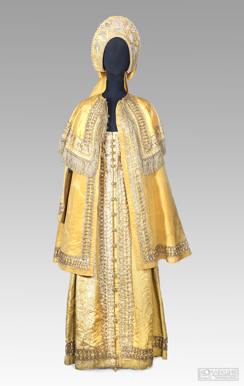 - Бальное платье фрейлины с коронационного бала 1896 года. Платье было изготовлено к куртагу 16 мая 1896 года в Москве, данному по случаю коронации последнего русского царя Николая II и царицы Александры Фёдоровны. Кокошник расшит жемчугом и бусами, сзади — муаровая шёлковая лента. Сарафан — из парчи, украшен золотой тесьмой и серебряными позолоченными пуговицами. Душегрея – из парчи, украшена золотой тесьмой и серебряными позолоченными пуговицами. Антикварный Салон «На Патриарших»