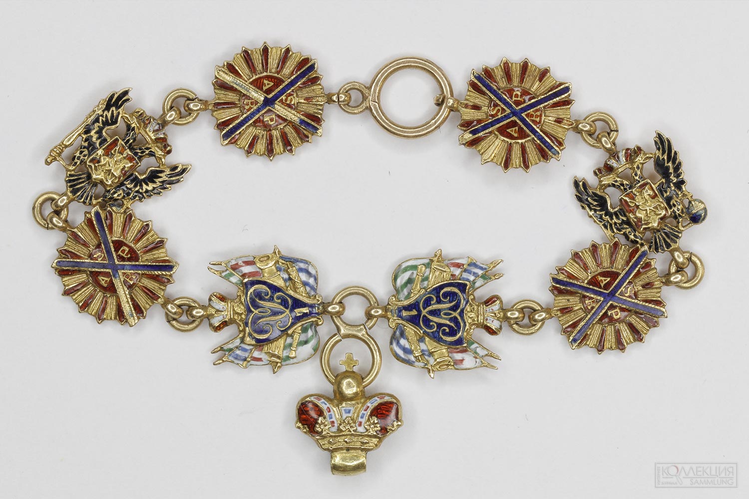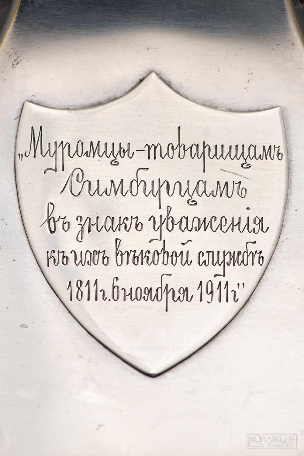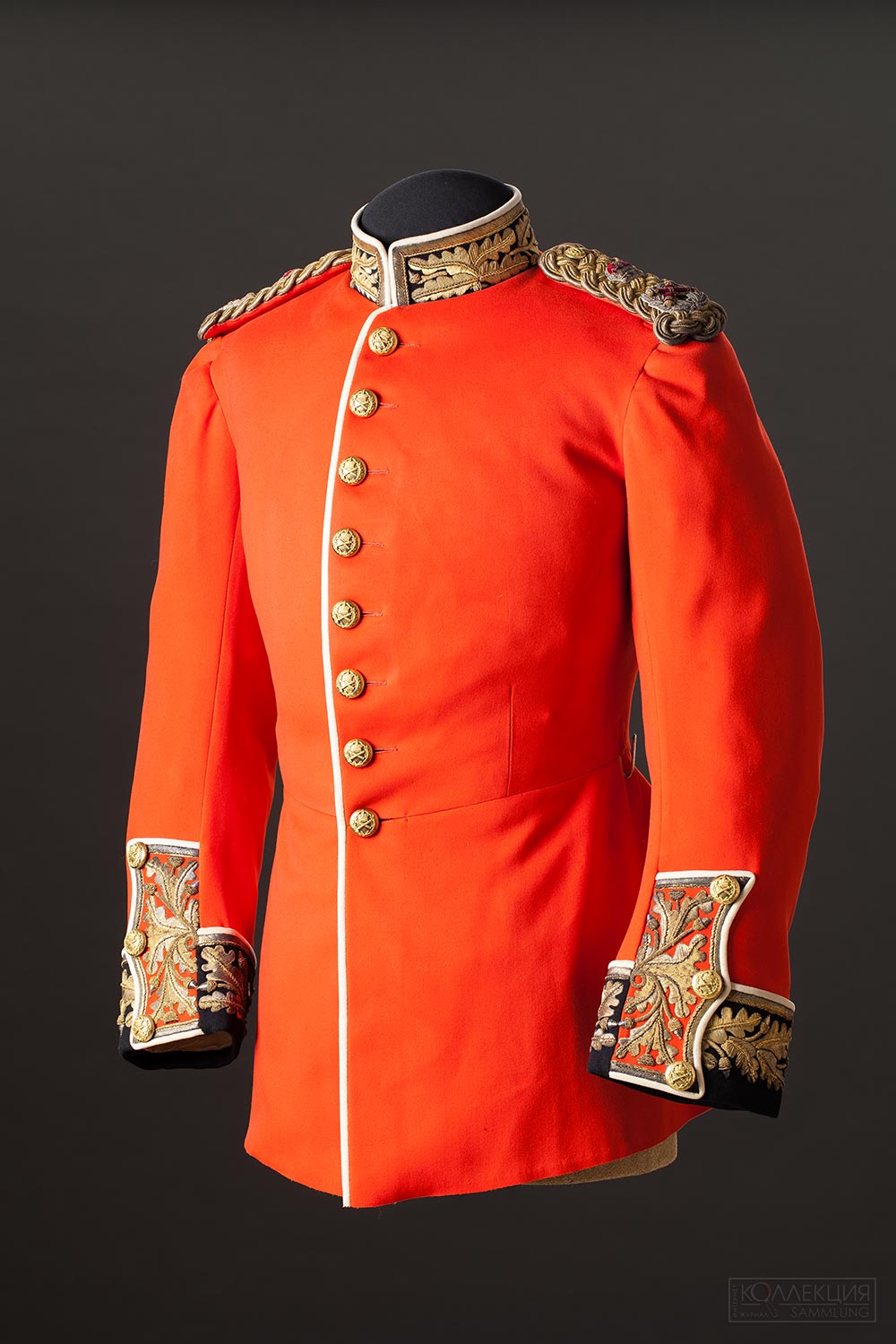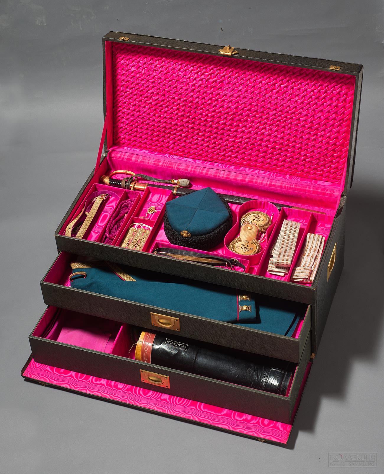 - Сундук с 19-ю предметами обмундирования подпоручика лейб-гвардии 4-го стрелкового Императорской Фамилии полка. Российская империя. 1911. Комплект состоит из мундира, пары эполет, пары погон, офицерской румахи-косоворотки, пояса, шаровар, шапки, кокарды, пары поясов, пару портупей и пары сапог. ГИМ
